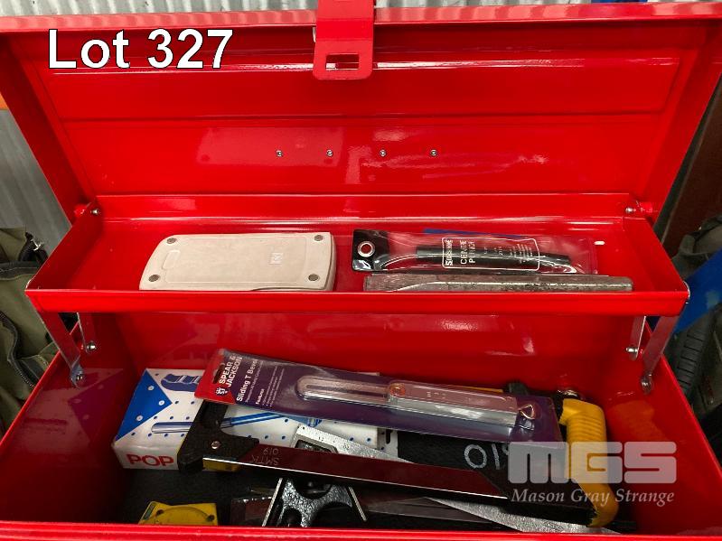 TOOLBOX INCLUDING SCREWDRIVER SET, HAMMER, FILES, TAPE MEASURE, SQUARES, ETC & ENGINEERS TOOLBOX WITH OXY TORCH, G-CLAMPS, HAMMER, HACKSAW, RULERS, TAPE MEASURE, PLUS 3 DRAWER TOOL BOX 1 x SHELF