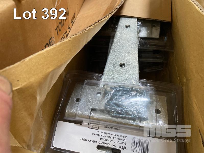 BOXES OF MEASURING TAPES, GATE HINDGES, ETC