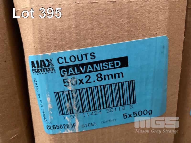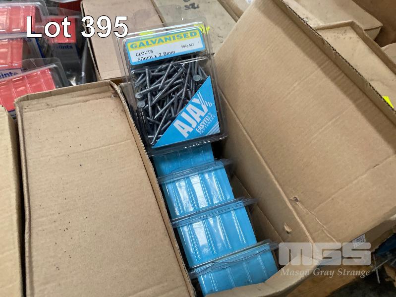 BOXES OF NEW CONCTETE NAILS, BOLTS, HINGES, CLOUTS, ETC