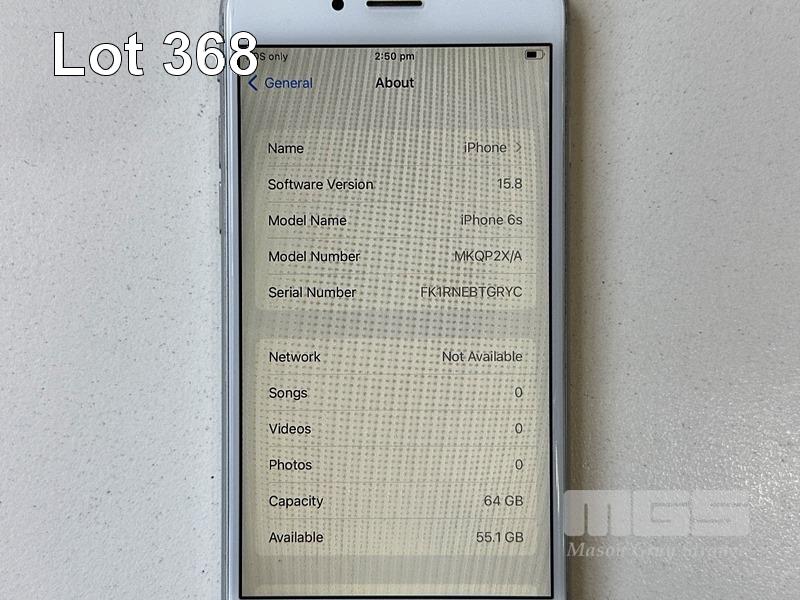 APPLE iPHONE 6s, 64GB, SILVER, MODEL A1688 (NO CABLE, NO CHARGER) (NOTE: MINOR SCRATCHES ON SCREEN) S/N:FK1RNEBTGRYC