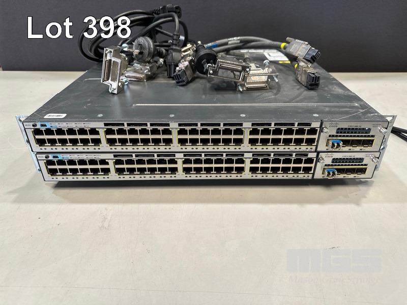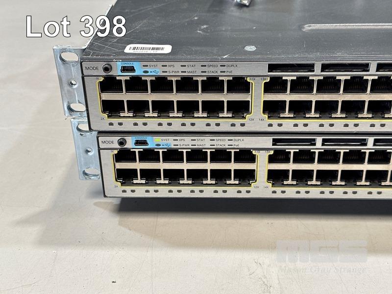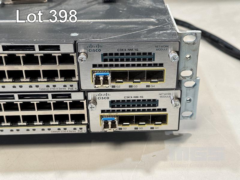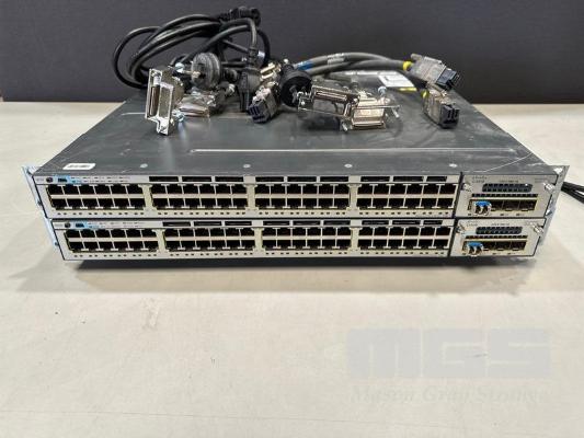 2 x CISCO CATALYST 3750-X SERIES 48-PORT SWITCHES, WS-C3750X-48P-S V05 EACH WITH C3KX-NM-1G NETWORK MODULE, STACK CABLES & IEC-C15 NOTCH POWER CABLES S/N:FDO1723R086, FDO1722R1S8