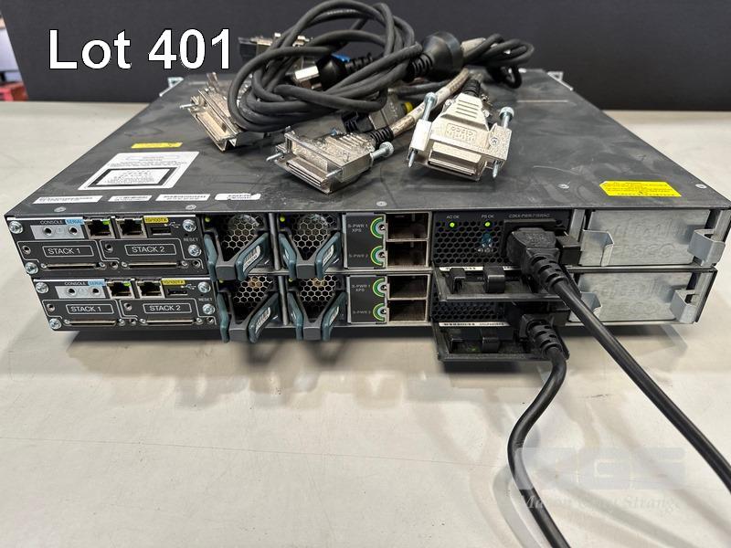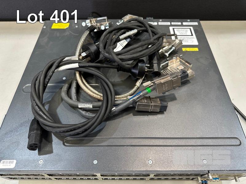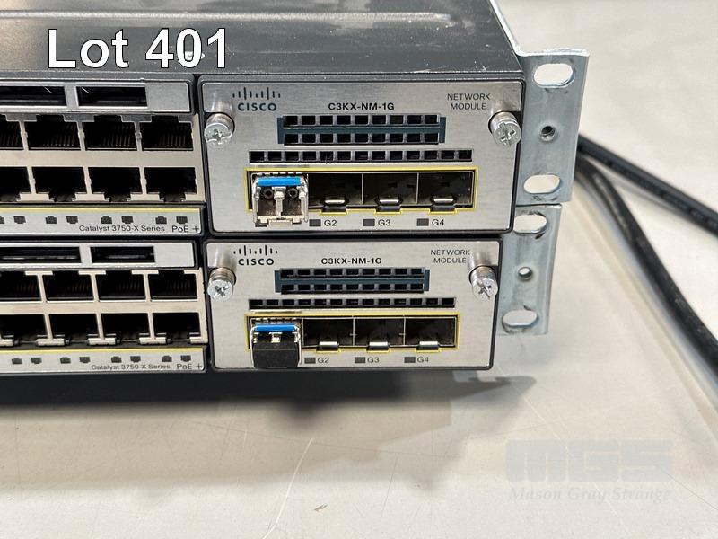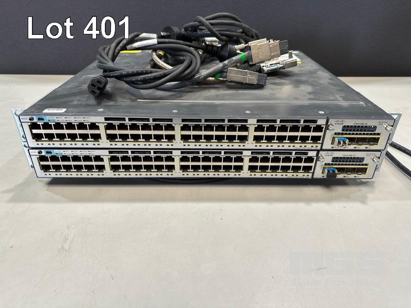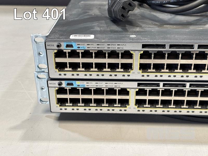 2 x CISCO CATALYST 3750-X SERIES 48-PORT SWITCHES, WS-C3750X-48P-S V03 EACH WITH C3KX-NM-1G NETWORK MODULE, STACK CABLES & IEC-C15 NOTCH POWER CABLES S/N:FDO1631P07J, FDO1630R3XU