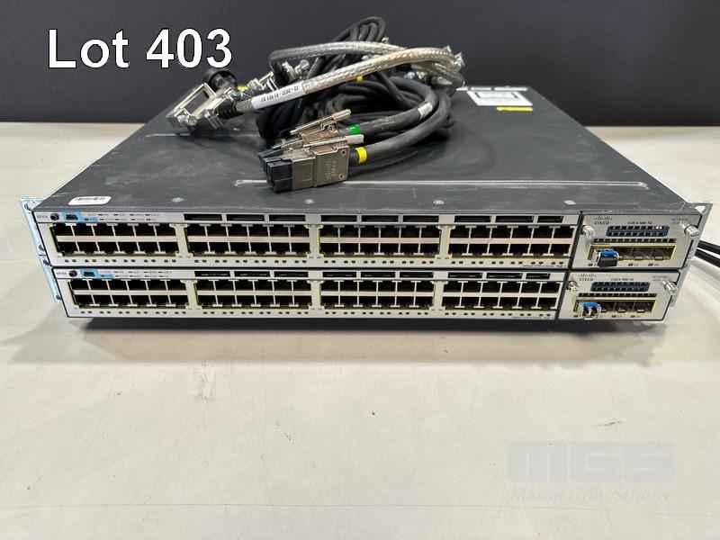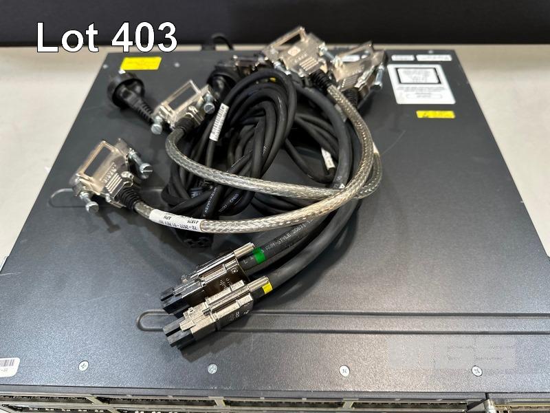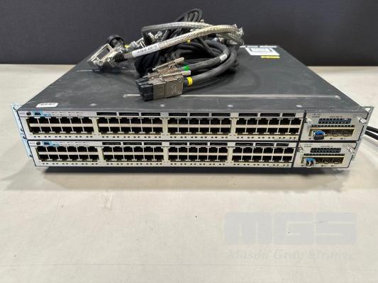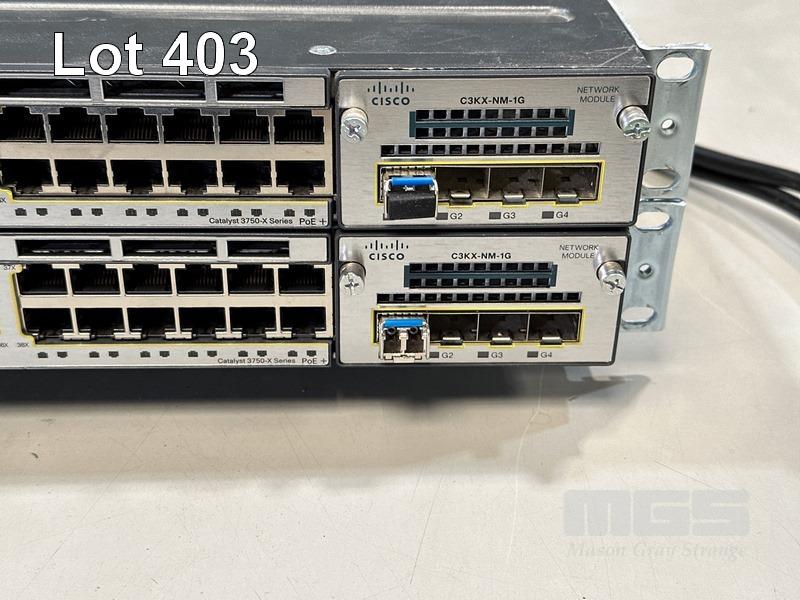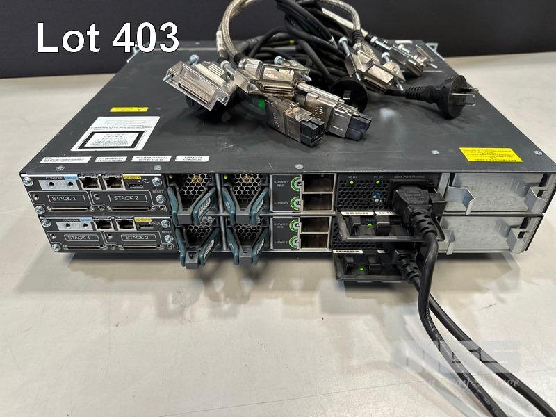 2 x CISCO CATALYST 3750-X SERIES 48-PORT SWITCHES, WS-C3750X-48P-S V03 EACH WITH C3KX-NM-1G NETWORK MODULE, STACK CABLES & IEC-C15 NOTCH POWER CABLES S/N:FDO1630P1W4, FDO1636X1RL