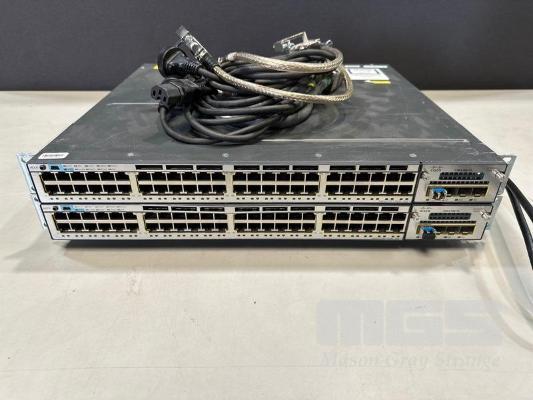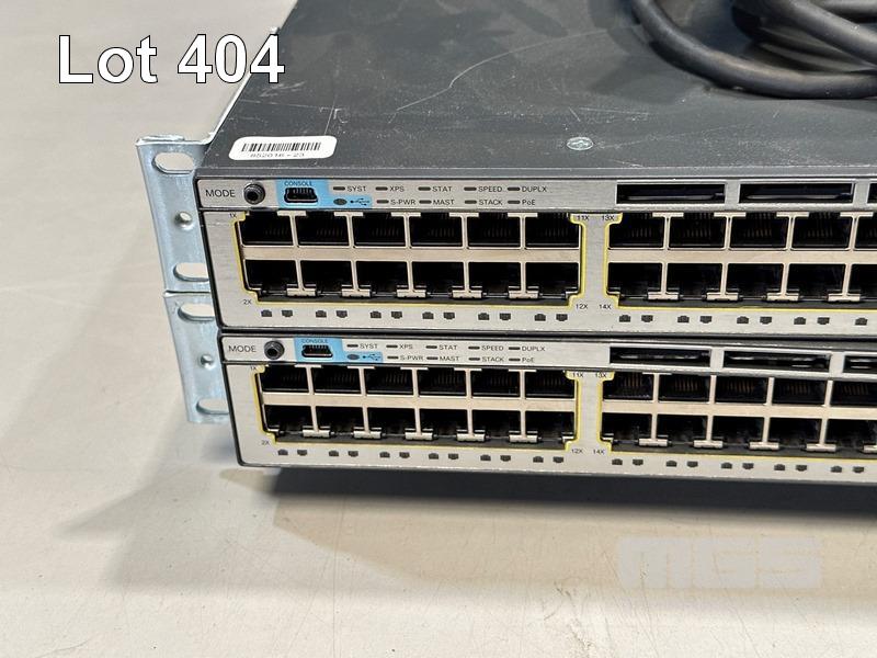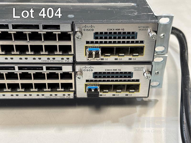 2 x CISCO CATALYST 3750-X SERIES 48-PORT SWITCHES, WS-C3750X-48P-S V03 EACH WITH C3KX-NM-1G NETWORK MODULE, STACK CABLES & IEC-C15 NOTCH POWER CABLES S/N:FDO1628R312, FDO1628V1SQ