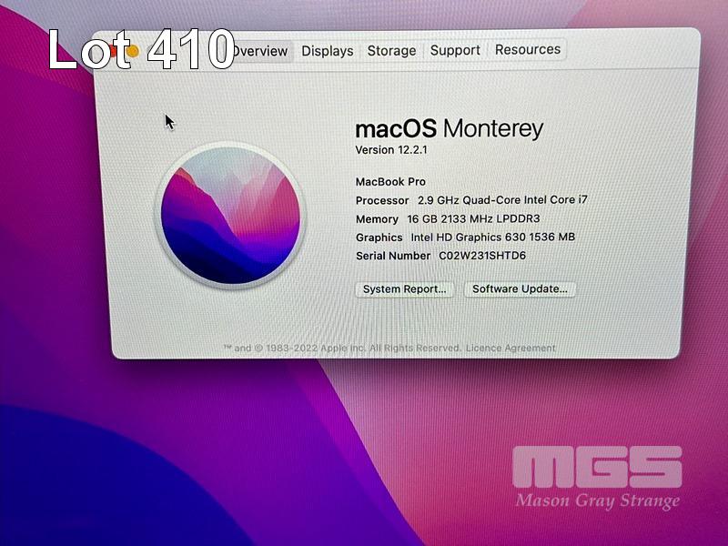 LAPTOP, APPLE MACBOOK PRO (A1707), CORE i7 7820HQ (7TH GEN) @ 2.9GHz, 16GB DDR3 RAM, 512GB SSD, 15.4" RETINA DISPLAY (2880x1800), INTEL HD GRAPHICS 630, THUNDERBOLT 3, TOUCHBAR, Wi-Fi, BLUETOOTH, MAC OS 12 INSTALLED & USB-C POWER SUPPLY (NOTE: SMALL SCRATCH ON SCREEN, MINOR MARKS ON SCREEN) S/N:C02W231SHTD6