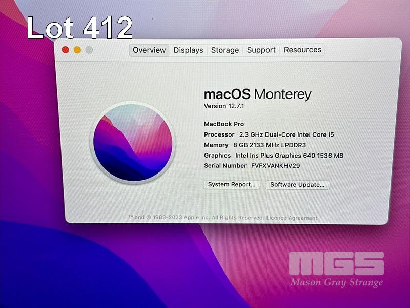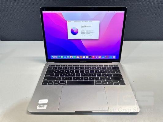 LAPTOP, APPLE MACBOOK PRO (A1708), CORE i5 7360U (7TH GEN) @ 2.3GHz, 8GB DDR3 RAM, 256GB SSD, 13.3" RETINA DISPLAY (2560x1600), INTEL IRIS PLUS GRAPHICS 640, THUNDERBOLT 3, Wi-Fi, BLUETOOTH, MAC OS 12 INSTALLED (NO USB-C POWER SUPPLY) (NOTE: SMALL SCRATCH ON SCREEN, MINOR MARKS ON SCREEN) S/N:FVFXVANKHV29