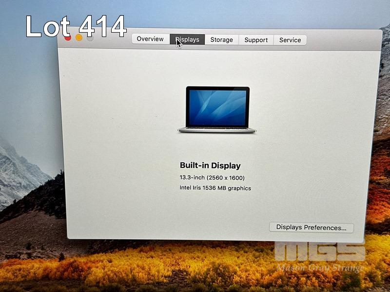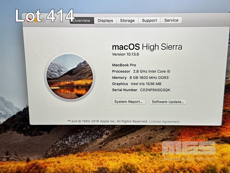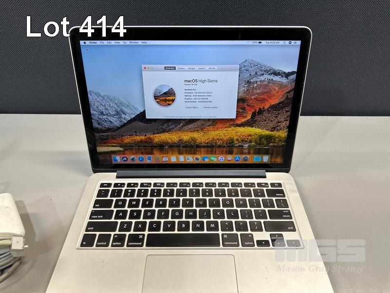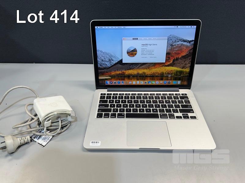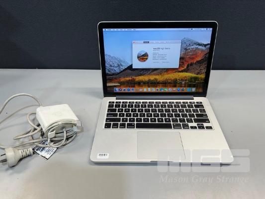 LAPTOP, APPLE MACBOOK PRO (A1502), CORE i5 4308U (4TH GEN) @ 2.8GHz, 8GB DDR3 RAM, 512GB SSD, 13.3" DISPLAY (2560x1600), INTEL IRIS GRAPHICS, Wi-Fi, BLUETOOTH, MAC OS 10.13 INSTALLED & POWER SUPPLY (NOTE: MINOR MARKS ON SCREEN) S/N:C02NP5N5G3QK