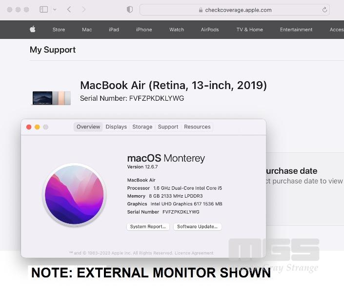 LAPTOP, APPLE MACBOOK AIR (A1932), CORE i5 8210Y (8TH GEN) @ 1.6GHz, 8GB DDR3 RAM, 128GB SSD, 13.3" RETINA WIDESCREEN (2560x1600), INTEL UHD GRAPHICS 617, Wi-Fi, BLUETOOTH, MAC OS 12 INSTALLED (NO USB-C POWER SUPPLY) (NOTE: DAMAGED SCREEN) S/N:FVFZPKDKLYWG