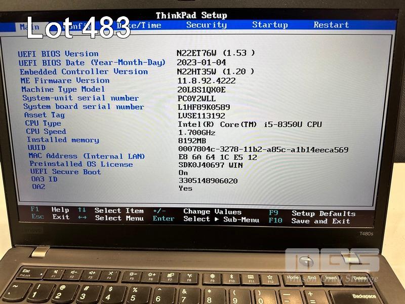LAPTOP, LENOVO THINKPAD T480s, TYPE 20L8, CORE i5 8350U (8TH GEN) @ 1.7GHz, 8GB DDR4 RAM, 256GB NVMe M.2 SSD, 14" TOUCHSCREEN (1920x1080), INTEL HD VIDEO, Wi-Fi, BLUETOOTH, WINDOWS 11 PRO INSTALLED (NO USB-C POWER SUPPLY) (NOTE: MINOR MARKS ON SCREEN) S/N:PC0Y2WLL