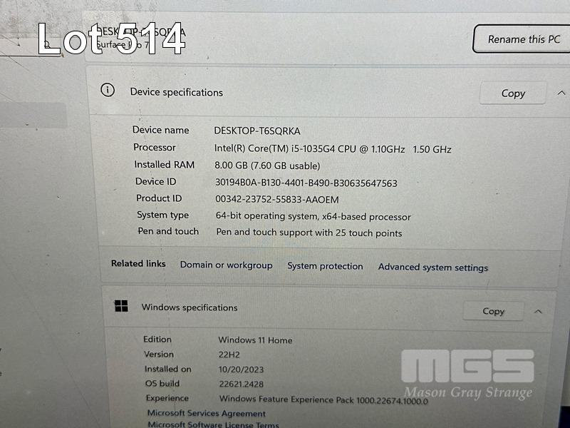 TABLET PC, MICROSOFT SURFACE PRO 7, MODEL 1866, CORE i5 1035G4 (10TH GEN) @ 1.1GHz, 8GB RAM, 128GB SSD, 12.3" TOUCHSCREEN (2736x1824), INTEL IRIS PLUS GRAPHICS, Wi-Fi, BLUETOOTH, WINDOWS 11 HOME INSTALLED, KEYBOARD TYPE COVER & GENERIC POWER SUPPLY (NOTE: DAMAGED) S/N:071353294953