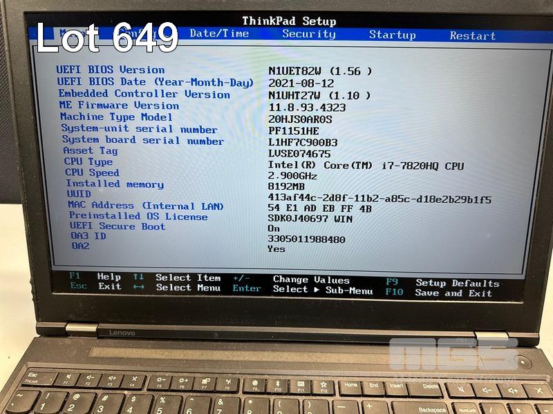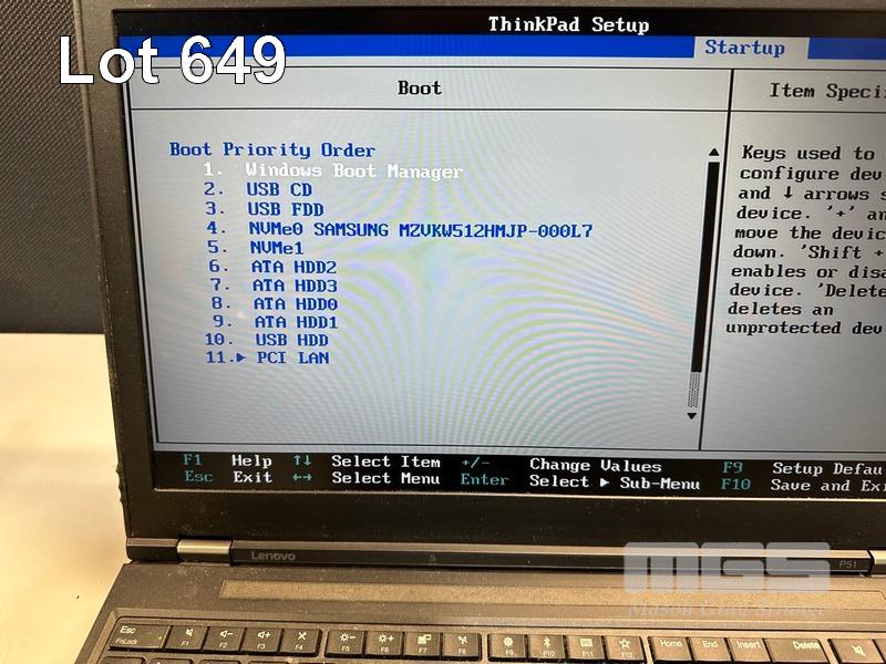 LAPTOP, LENOVO THINKPAD P51 MOBILE WORKSTATION, TYPE 20HJ, CORE i7 7820HQ (7TH GEN) @ 2.9GHz, 8GB DDR4 RAM, 512GB NVMe M.2 SSD, 15.6" WIDESCREEN (1920x1080), 4GB NVIDIA QUADRO M2200 VIDEO, Wi-Fi, BLUETOOTH, WINDOWS 10 PRO INSTALLED (NO POWER SUPPLY) (NOTE: POOR CONDITION, MOUSE FAULT, MARKS & BRIGHT SPOTS ON SCREEN) S/N:PF1151HE