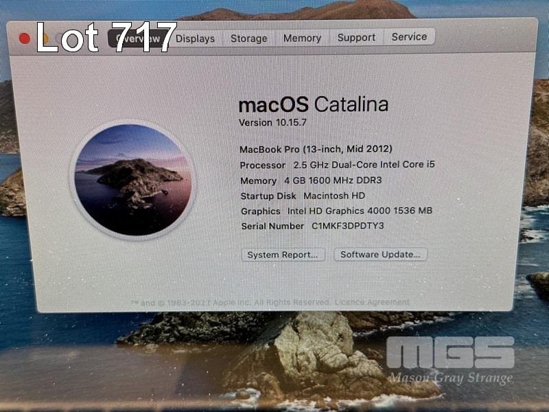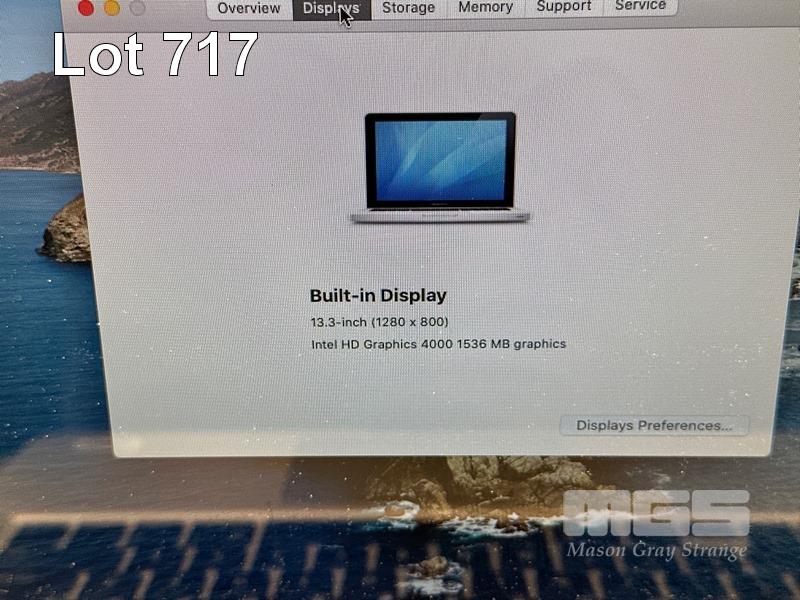 LAPTOP, APPLE MACBOOK PRO (A1278), CORE i5 3210M (3RD GEN) @ 2.5GHz, 4GB DDR3 RAM, 500GB SATA HDD, DVD-RW, 13.3" WIDESCREEN (1280x800), INTEL HD VIDEO, Wi-Fi, BLUETOOTH, MAC OS 10.15 INSTALLED & POWER SUPPLY S/N:C1MKF3DPDTY3