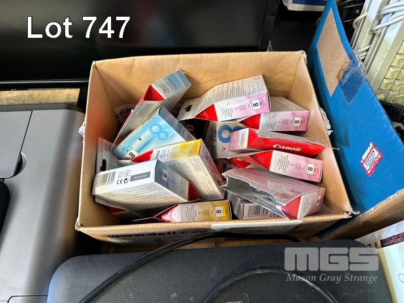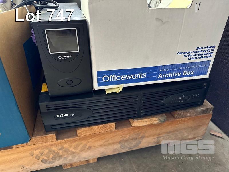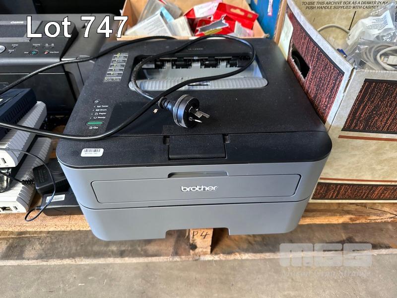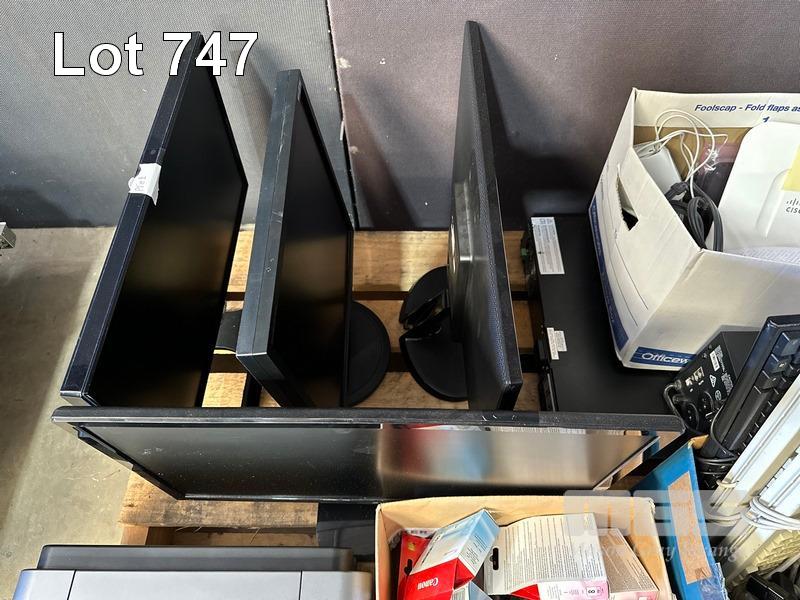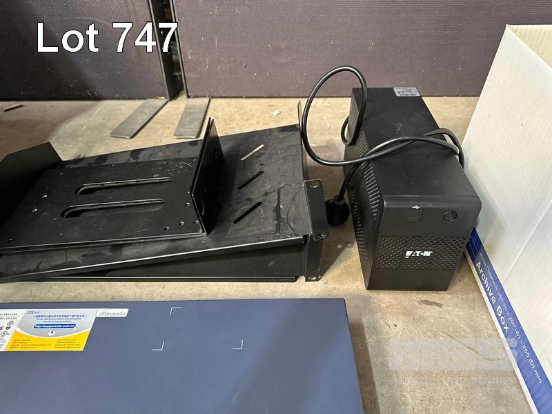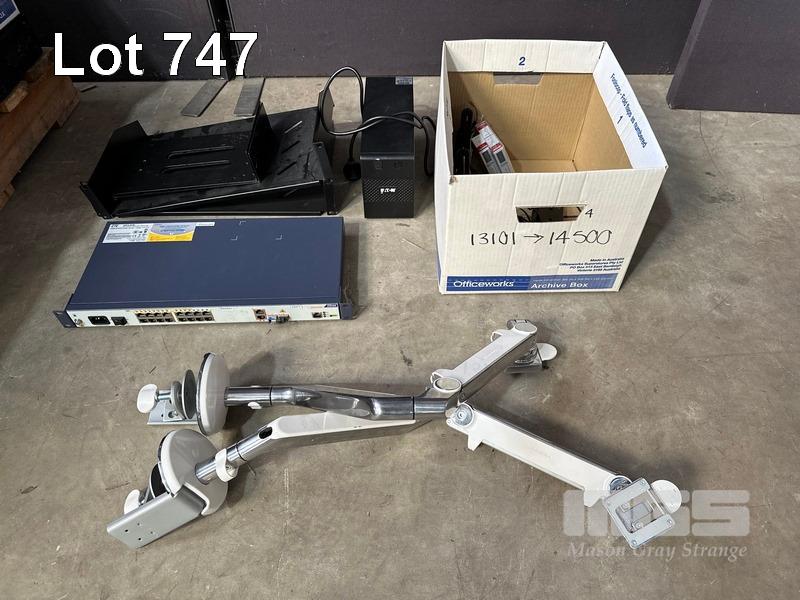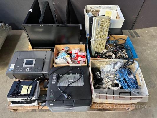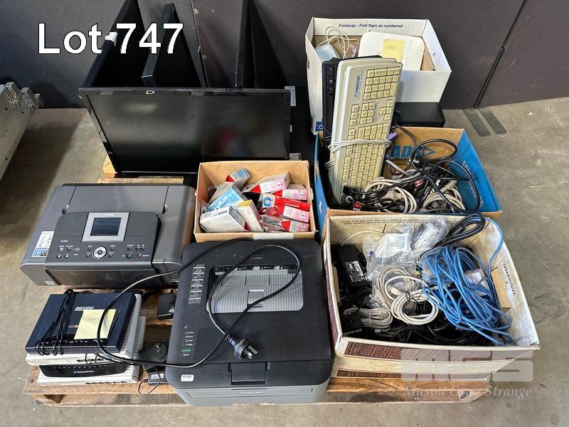 1 x PALLET LOT INC. BROTHER PRINTER, CANON PRINTER, INK CARTRIDGES, CABLES, MODEMS, 4 x MONITORS, CISCO ACCESS POINT, EATON & DIGITECH UPS, INCOMPLETE MONITOR ARMS, ZTE SWITCH, RACKMOUNT TRAYS, PLANTRONICS HEADSETS