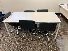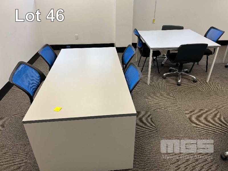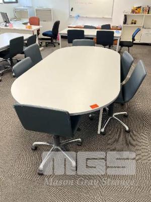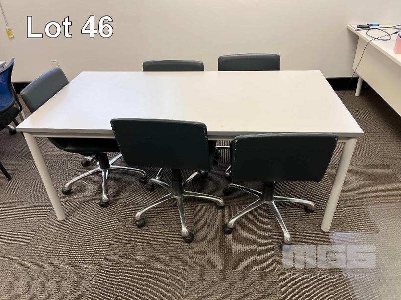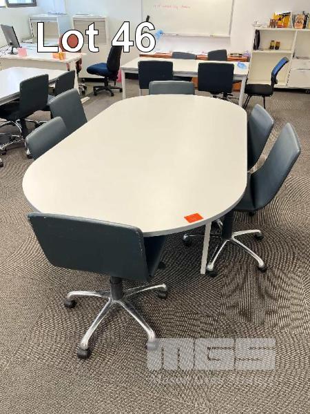 1 x BOARDROOM TABLE, STEEL FRAME GREY TIMBER LAMINATE TOP 2400 x 1200mm 1 x GREY TIMBER LAMINATE DESK 1800 x 900mm 3 x GREY TIMBER LAMINATE CLASSROOM TABLES, STEEL FRAME 2 @ 1800 x 900mm 1 @ 1200 x 1200mm (LOCATED ON 7TH FLOOR) 17 x GASLIFT OFFICE CHAIRS, BLACK VINYL, CHROME BASE 6 x CLOTH CLASSROOM CHAIRS, PLASTIC BASES
