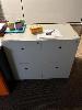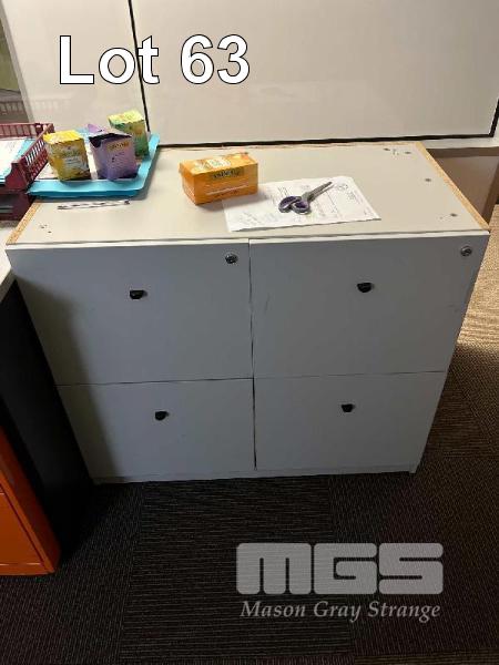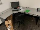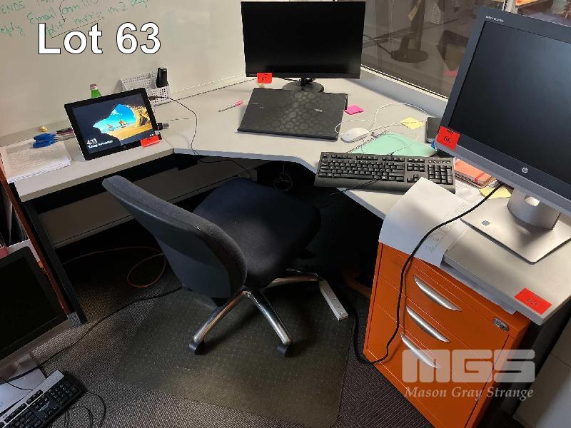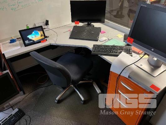2 x TIMBER LAMINATE L SHAPE DESKS, 1800 x 1700mm, GREY, WITH 3 DRAWER UNDER DESK MOBILE, 3 TIER TIMBER LAMINATE BOOK SHELF, 4 DRAWER STORAGE CABINET, TIMBER LAMINATE, 2x GAS LIFT OFFICE CHAIRS (LOCATED ON 7TH FLOOR)