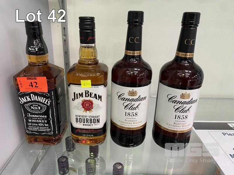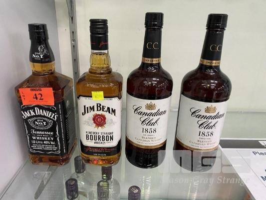 2 x BOTTLES CANADIAN CLUB 1858, 1 LITRE, 1 x BOTTLE JIM BEAM BOURBON WHISKY, 1 LITRE & 1 x BOTTLE JACK DANIELS WHISKY, 1 LITRE