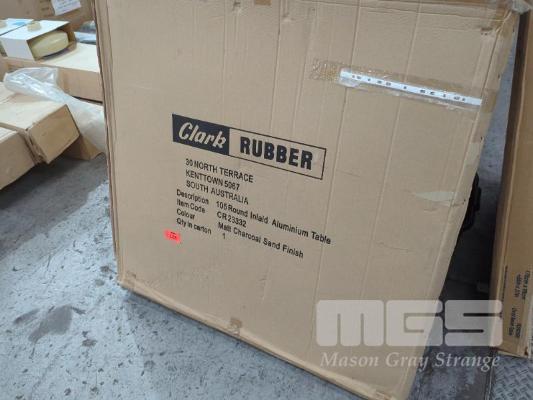 CLARK RUBBER ROUND INLAID ALUMINIUM OUTDOOR TABLE. GLASS WITH MATT CHARCOAL SAND COLOURED FRAME. 105 MM DIA. WITH UMBRELLA HOLE. NEW IN BOX.