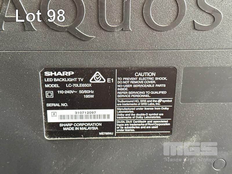 SHARP AQUOS 70" LED-BL TV, MODEL LC-70LE650X (NO REMOTE, NO STAND) (NOTE: SMALL BRIGHT SPOTS ON SCREEN) S/N:310712097