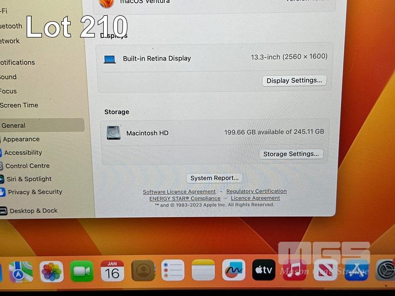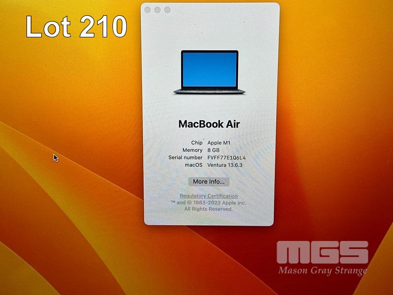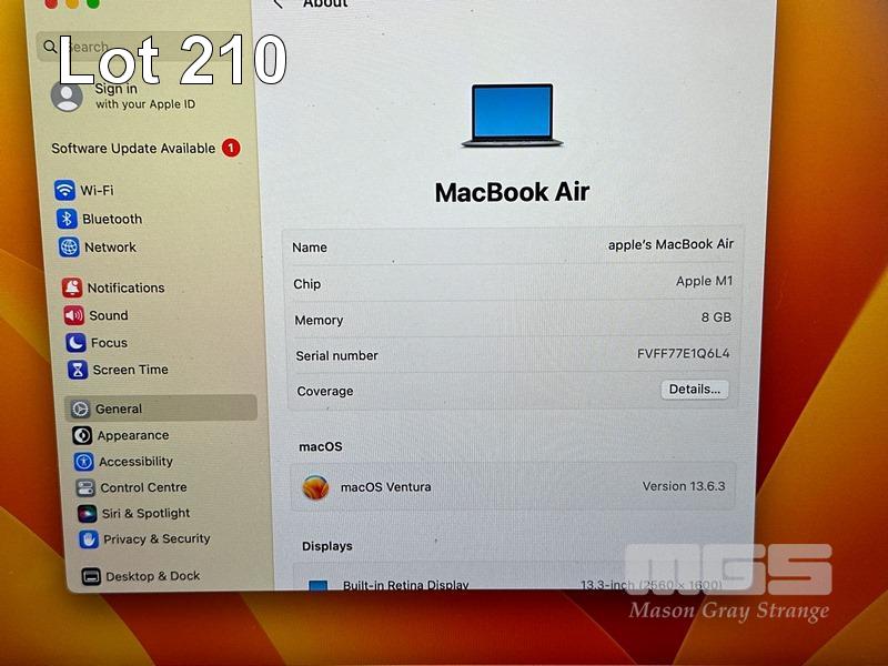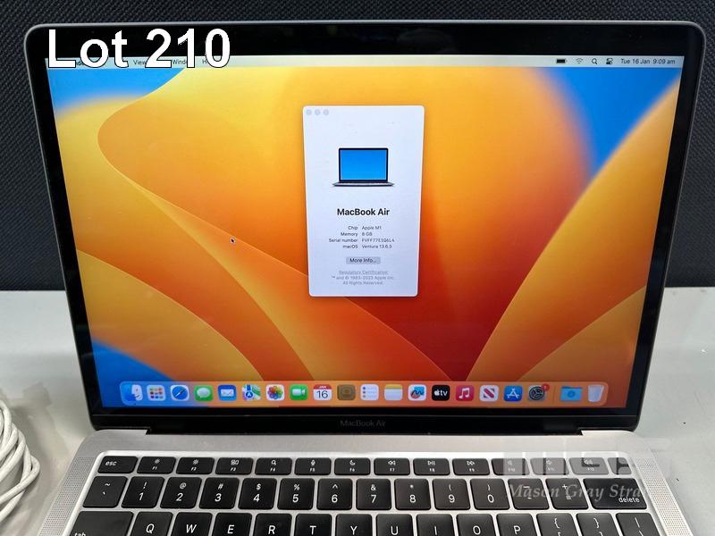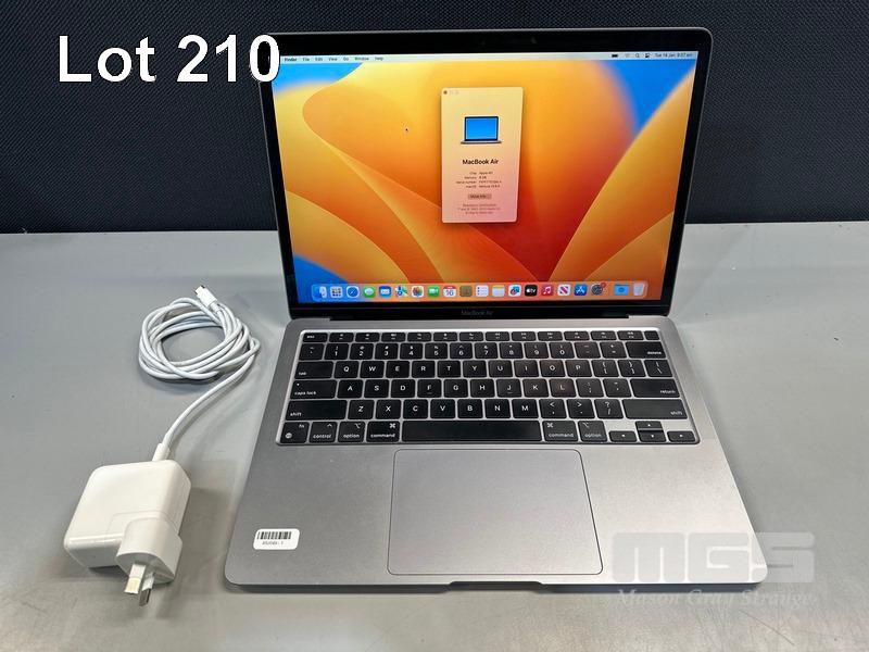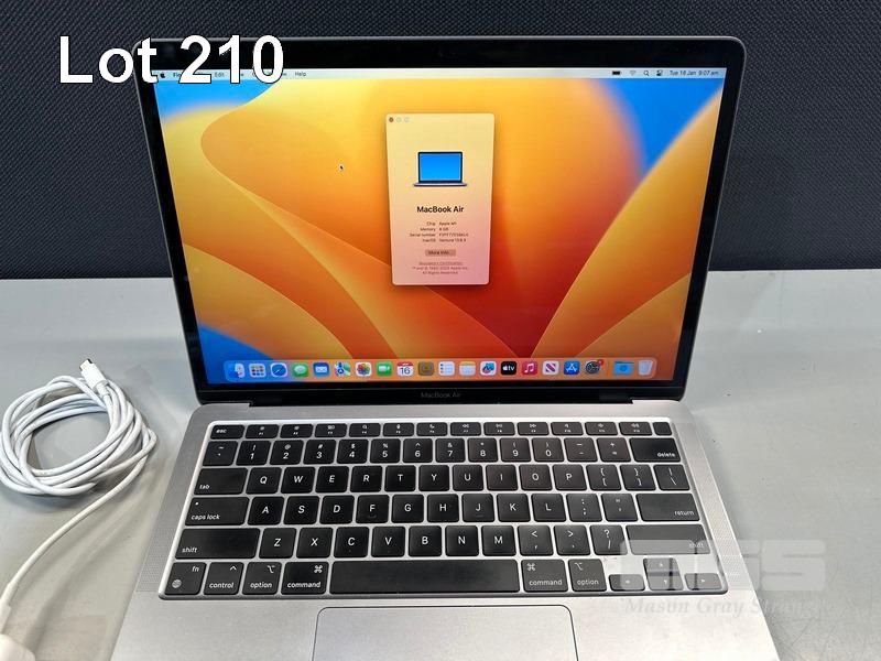 LAPTOP, APPLE MACBOOK AIR (A2337), MGN63X/A, APPLE M1 8 CPU/7 GPU, 8GB RAM, 256GB SSD, 13.3" RETINA DISPLAY (2560x1600), THUNDERBOLT 3, Wi-Fi, BLUETOOTH, MAC OS 13 INSTALLED & USB-C POWER SUPPLY (NOTE: SCREEN BLEMISHES) S/N:FVFF77E1Q6L4