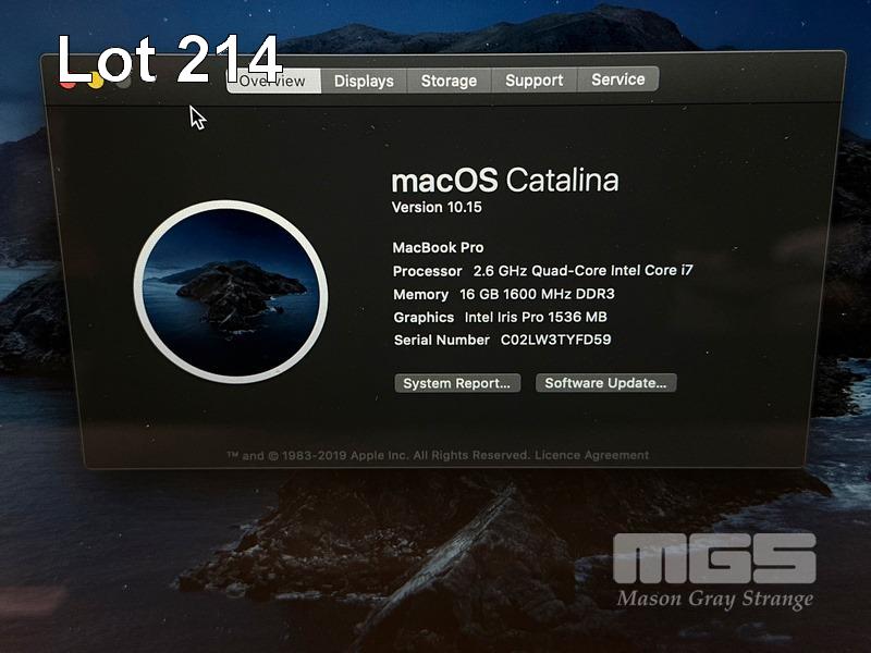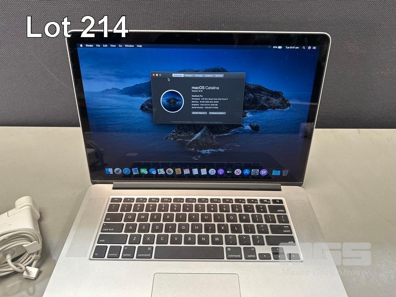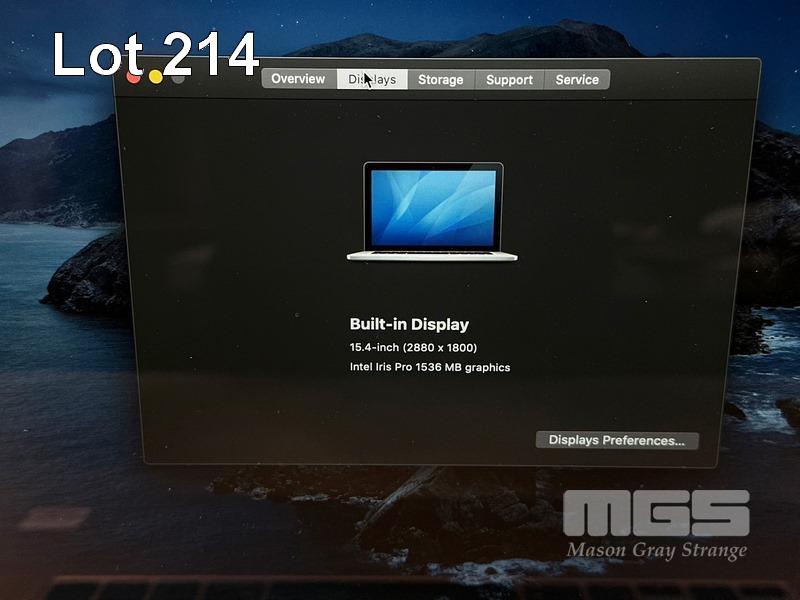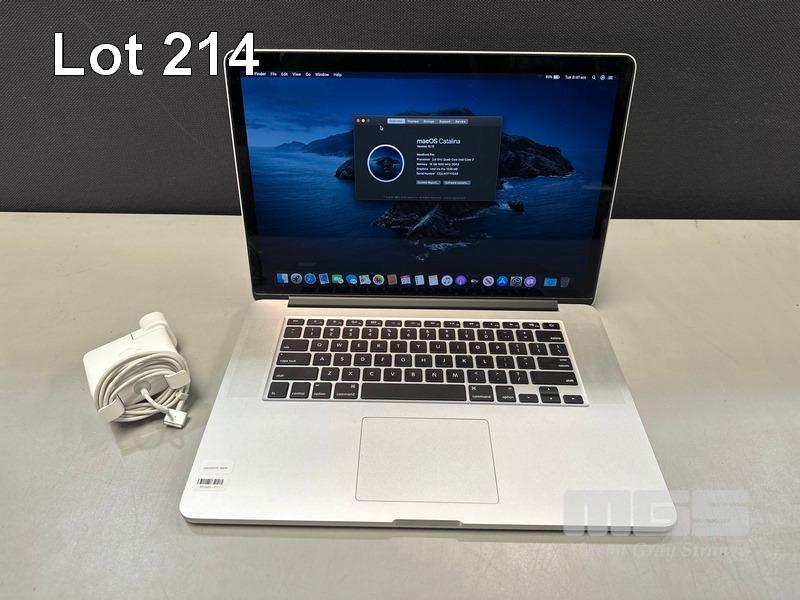 LAPTOP, APPLE MACBOOK PRO (A1398), CORE i7 4960HQ (4TH GEN) @ 2.6GHz, 16GB DDR3 RAM, 512GB SSD, 15.4" RETINA DISPLAY (2880x1800), INTEL IRIS PRO GRAPHICS, Wi-Fi, BLUETOOTH, MAC OS 10.15 INSTALLED & POWER SUPPLY (NOTE: MINOR MARKS ON SCREEN) S/N:C02LW3TYFD59