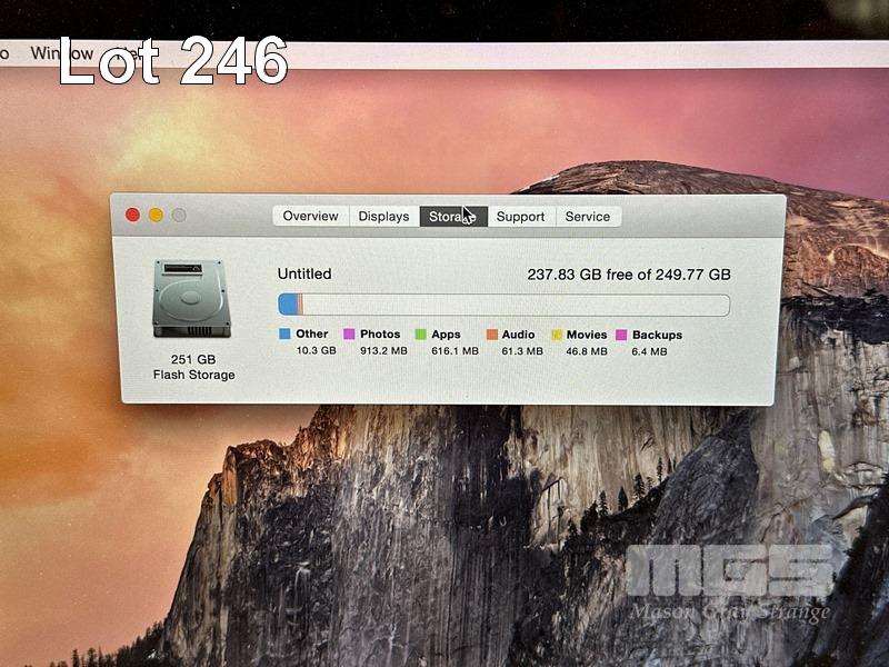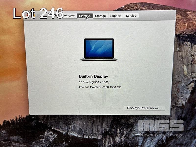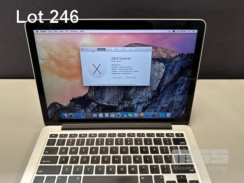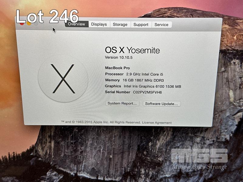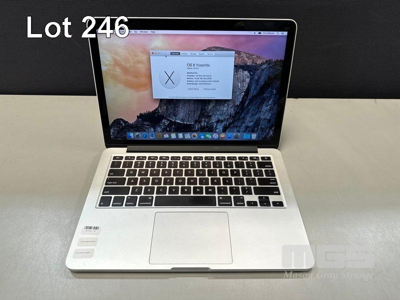 LAPTOP, APPLE MACBOOK PRO (A1502), CORE i5 5287U (5TH GEN) @ 2.9GHz, 16GB DDR3 RAM, 256GB SSD, 13.3" RETINA DISPLAY (2560x1600), INTEL IRIS GRAPHICS 6100, Wi-Fi, BLUETOOTH, MAC OS 10.10 INSTALLED (NO POWER SUPPLY) (NOTE: KEYBOARD & TOUCHPAD FAULTY, MINOR MARKS ON SCREEN) S/N:C02PV2M5FVH6