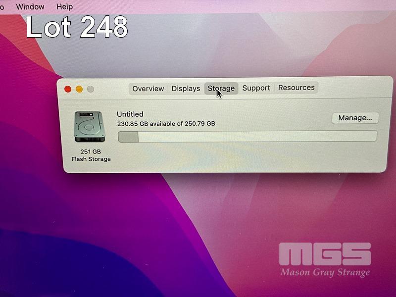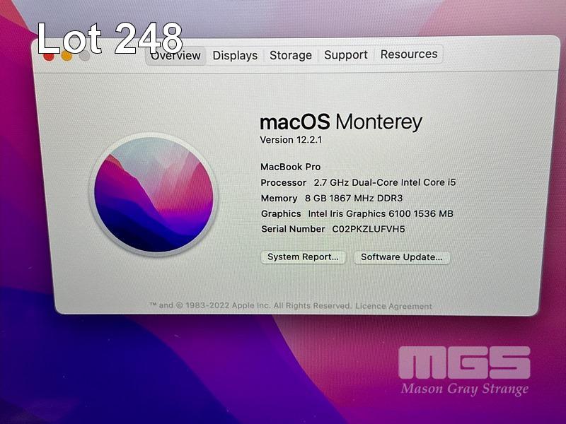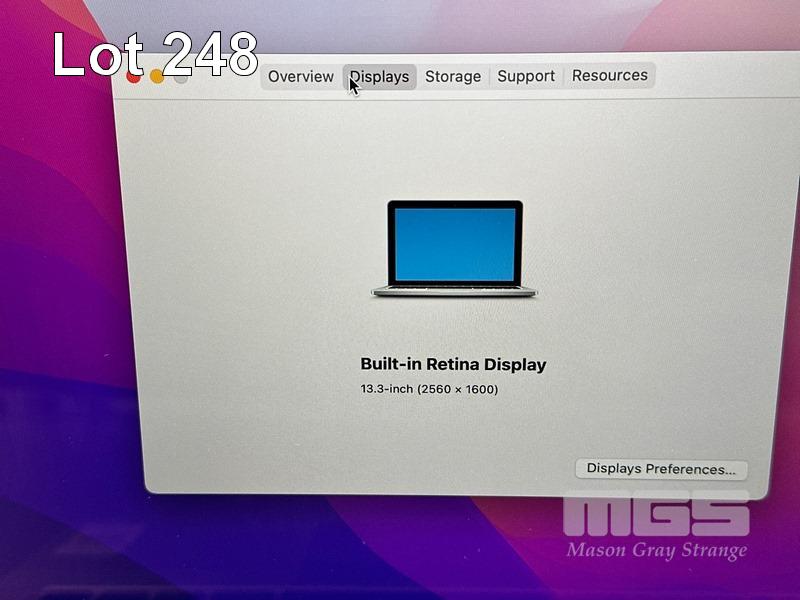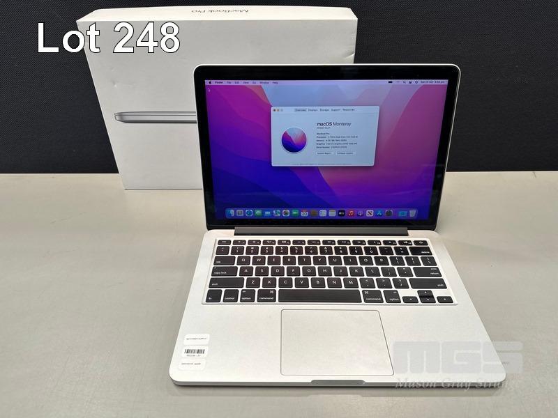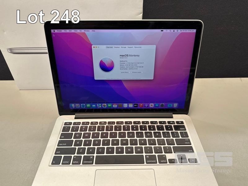 LAPTOP, APPLE MACBOOK PRO (A1502), CORE i5 5257U (5TH GEN) @ 2.7GHz, 8GB DDR3 RAM, 256GB SSD, 13.3" RETINA DISPLAY (2560x1600), INTEL IRIS GRAPHICS 6100, Wi-Fi, BLUETOOTH, MAC OS 12 INSTALLED (NO POWER SUPPLY) (NOTE: MINOR MARKS ON SCREEN) S/N:C02PKZLUFVH5