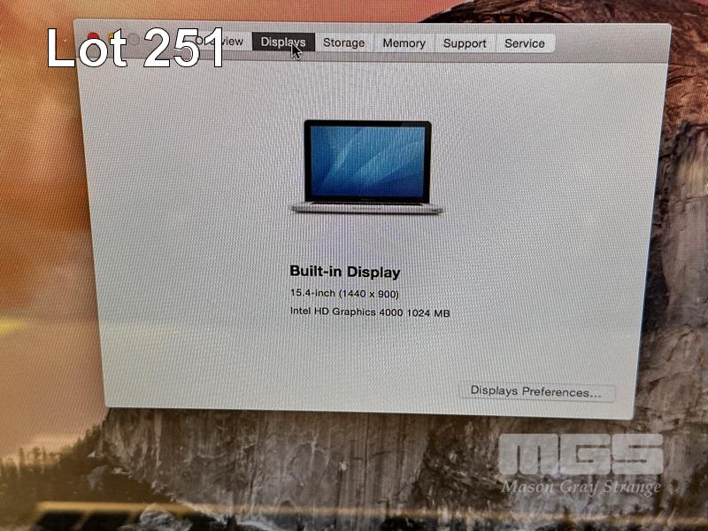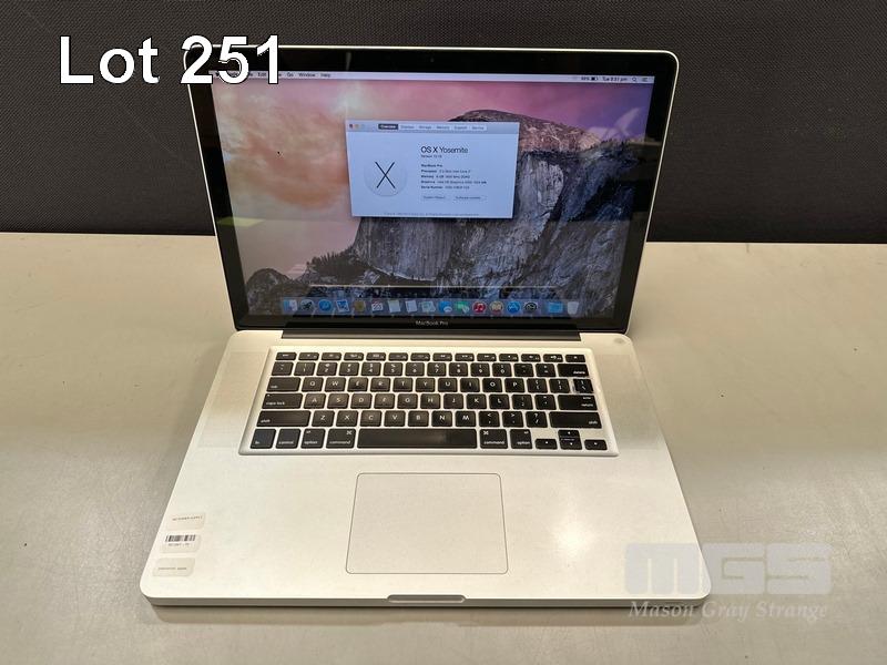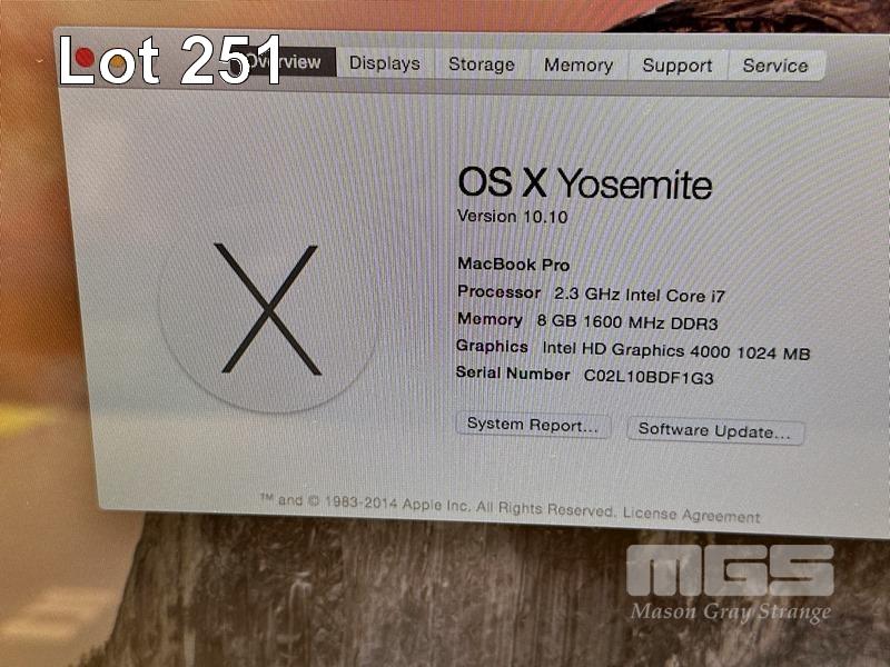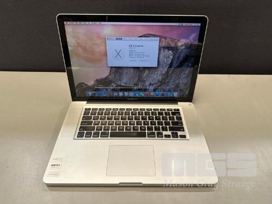 LAPTOP, APPLE MACBOOK PRO (A1286), CORE i7 3615QM (3RD GEN) @ 2.3GHz, 8GB DDR3 RAM, 500GB SATA HDD, DVD-RW, 15.4" WIDESCREEN (1440x900), INTEL HD GRAPHICS 4000, Wi-Fi, BLUETOOTH, MAC OS 10.10 INSTALLED (NO POWER SUPPLY) (NOTE: "\" KEY LOOSE ON KEYBOARD, MINOR MARKS ON SCREEN) S/N:C02L10BDF1G3