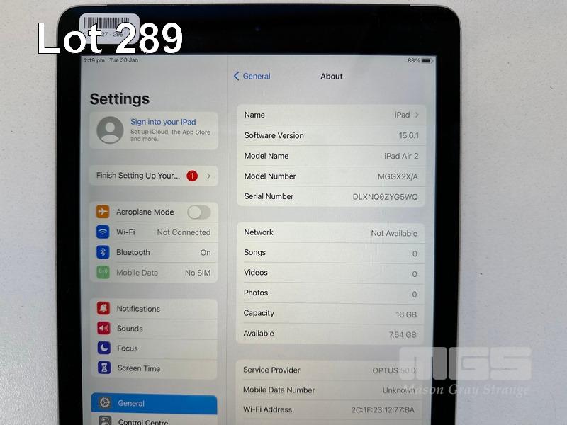APPLE iPAD AIR 2, 16GB, Wi-Fi, CELLULAR, SPACE GREY, MODEL A1567, MGGX2X/A (NO CHARGER, NO CABLE) (NOTE: MINOR SCRATCHES ON SCREEN) S/N:DLXNQ0ZYG5WQ