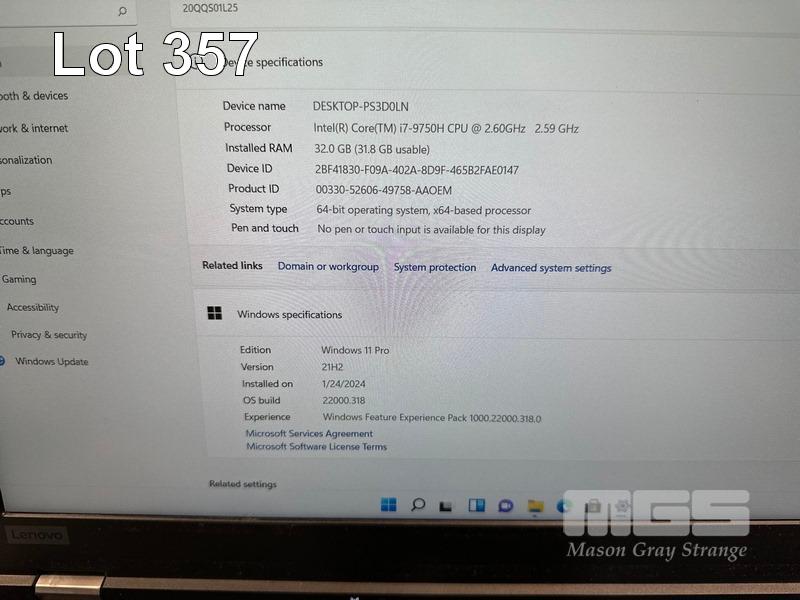 LAPTOP, LENOVO THINKPAD P53 MOBILE WORKSTATION, TYPE 20QQ, CORE i7 9750H (9TH GEN) @ 2.6GHz, 32GB DDR4 RAM, 512GB NVMe M.2 SSD, 15.6" WIDESCREEN (1920x1080), 4GB NVIDIA QUADRO T2000 VIDEO, Wi-Fi, BLUETOOTH, WINDOWS 11 PRO INSTALLED & POWER SUPPLY (NOTE: MARKS ON SCREEN0 S/N:PF1VV8WS