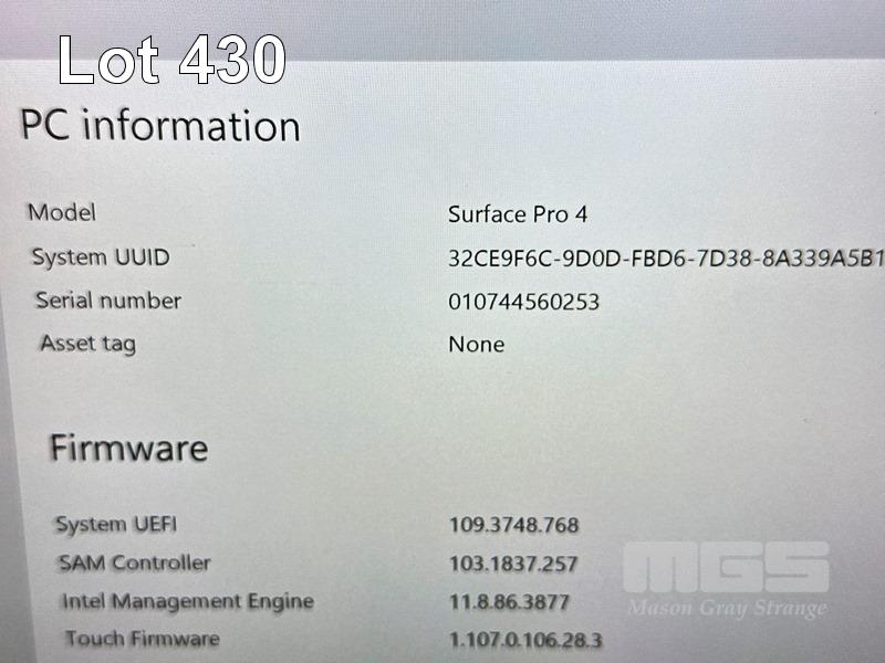 TABLET PC, MICROSOFT SURFACE PRO 4, MODEL 1724, CORE i7 6650U (6TH GEN) @ 2.2GHz, 16GB RAM, 256GB SSD, 12.3" TOUCHSCREEN (2736x1824), INTEL HD GRAPHICS 520, Wi-Fi, BLUETOOTH, WINDOWS 10 PRO INSTALLED, KEYBOARD TYPE COVER & POWER SUPPLY S/N:010744560253