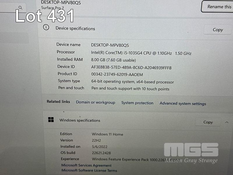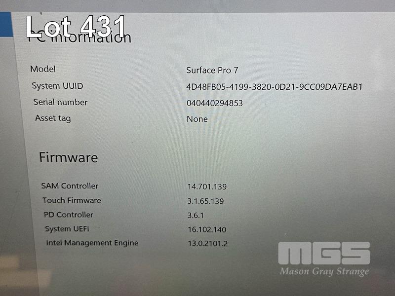 TABLET PC, MICROSOFT SURFACE PRO 7, MODEL 1866, CORE i5 1035G4 (10TH GEN) @ 1.1GHz, 8GB RAM, 128GB SSD, 12.3" TOUCHSCREEN (2736x1824), INTEL IRIS PLUS GRAPHICS, Wi-Fi, BLUETOOTH, WINDOWS 11 HOME INSTALLED, KEYBOARD TYPE COVER & POWER SUPPLY (NOTE: CRACK LINE ON SCREEN) S/N:040440294853