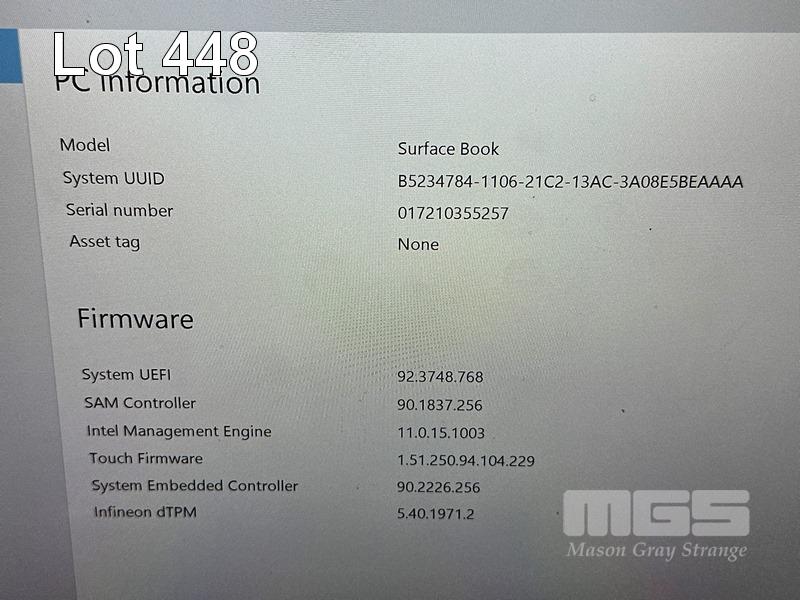 LAPTOP, MICROSOFT SURFACE BOOK, MODEL 1703, CORE i7 6600U (6TH GEN) @ 2.6GHz, 8GB DDR3 RAM, 256GB M.2 SSD, 13.5" TOUCHSCREEN (3000x2000), Wi-Fi, BLUETOOTH, WINDOWS 10 PRO INSTALLED (NO POWER SUPPLY) S/N:017210355257