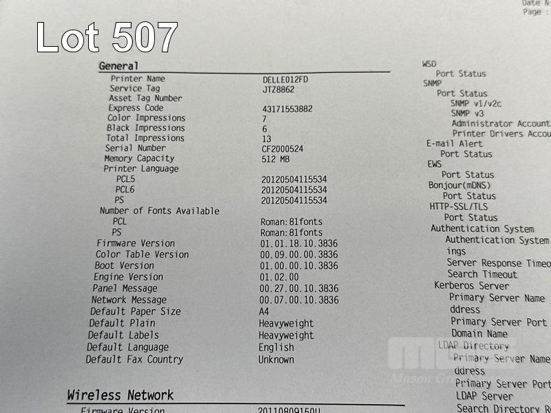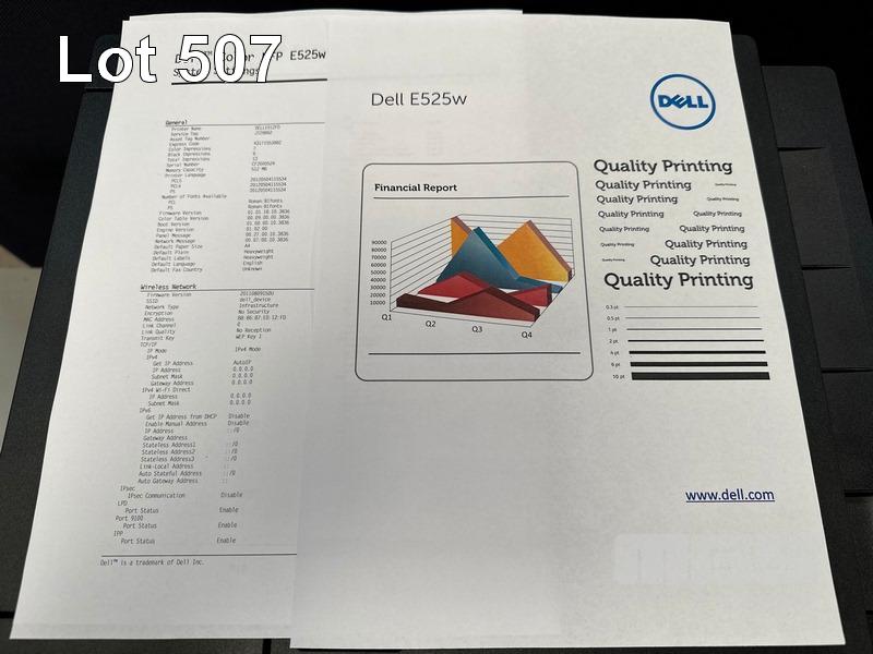 PRINTER, DELL E525w COLOUR MFC LASER, 7 COLOUR & 6 B&W PAGES SHOWING (TEST PAGE ATTACHED) S/N:JTZ8862