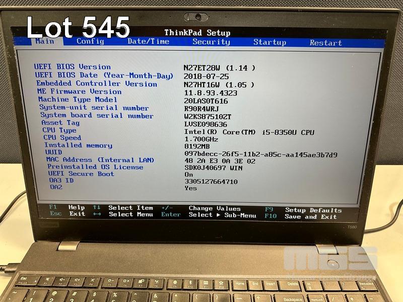 LAPTOP, LENOVO THINKPAD T580, TYPE 20LA, CORE i5 8350U (8TH GEN) @ 1.7GHz, 8GB DDR4 RAM, 256GB NVMe M.2 SSD, 15.6" WIDESCREEN (1920x1080), INTEL UHD GRAPHICS, Wi-Fi, BLUETOOTH, WINDOWS 11 PRO INSTALLED (NO USB-C POWER SUPPLY) (NOTE: NO BATTERY, MINOR MARKS ON SCREEN) S/N:R90R4WRJ