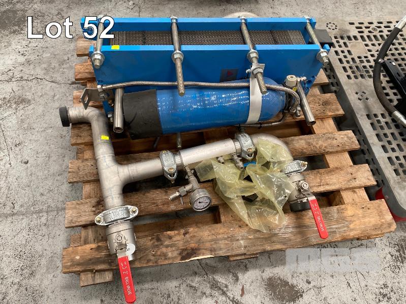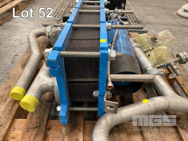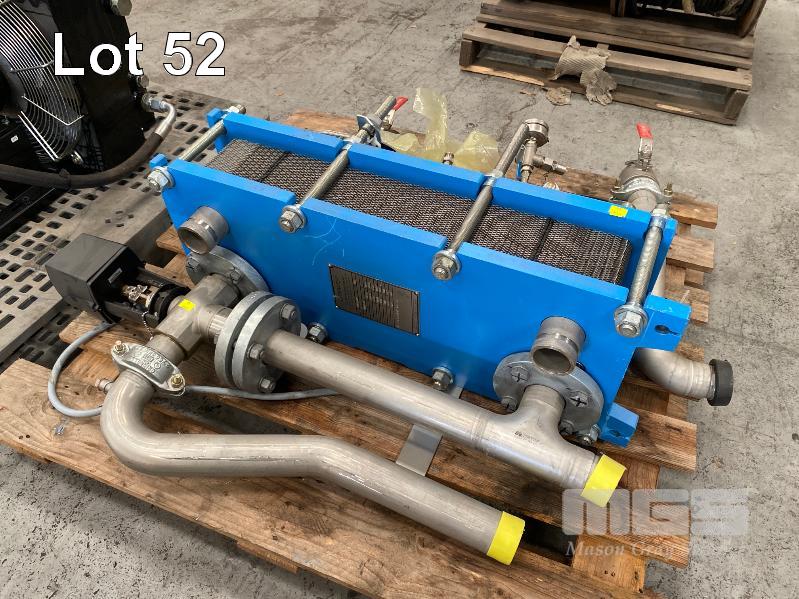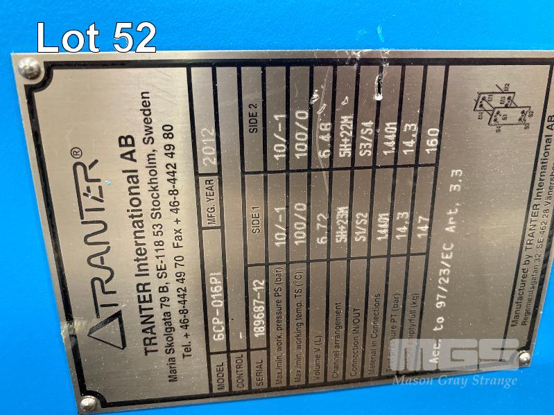 HEAT EXCHANGER, TRANTER INTERNATIONAL AB MOD: 6CP-016PI DOM: 2012 STAINLESS STEEL 830 x 320 x 200mm MAX WORKING PRESSURE: 10 BAR MAX WORKING TEMP: 100 DEGREE CELSIUS VOLUME: 6.72 LITRES WITH PIPEWORK ACTUATOR & PRESSURE VESSEL 1 x PALLET