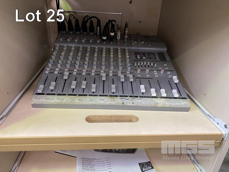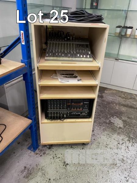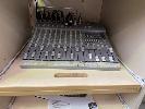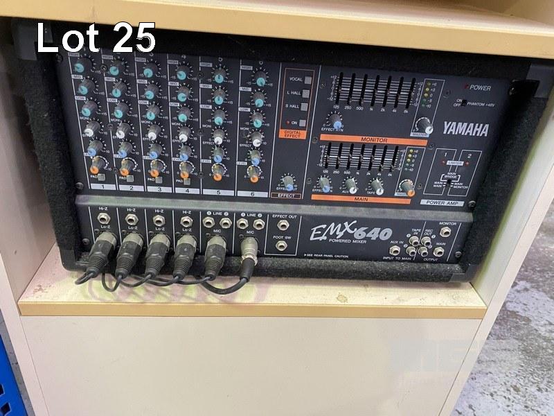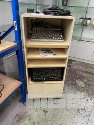 MIXING DESK, PEAK, PM184,14 CHANNEL, POWER MIXER, YAMAHA, EMX-640, BEHRINGER, SHARK, DSP110 ON MOBILE CABINE