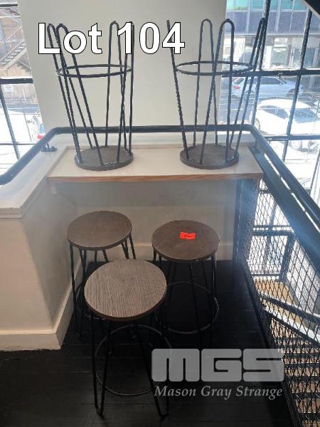 5 x TIMBER TOP BAR STOOLS, BLACK STEEL BASE