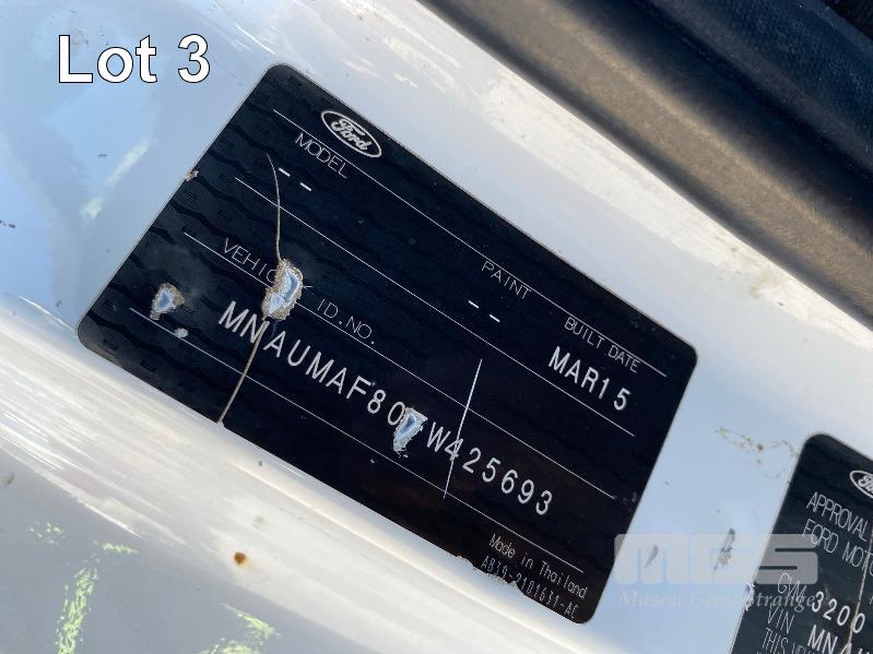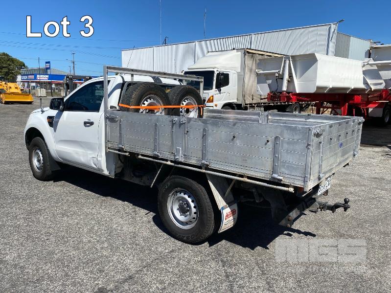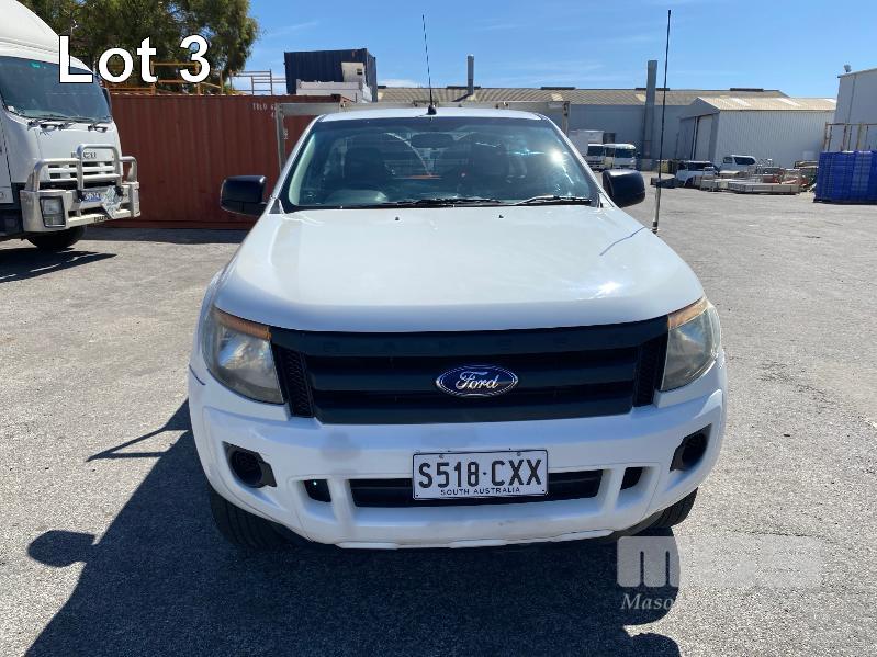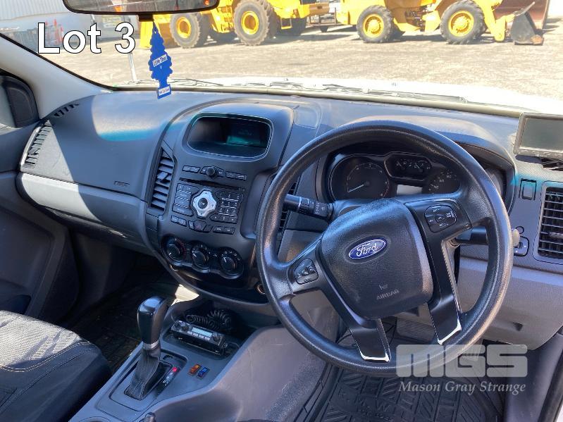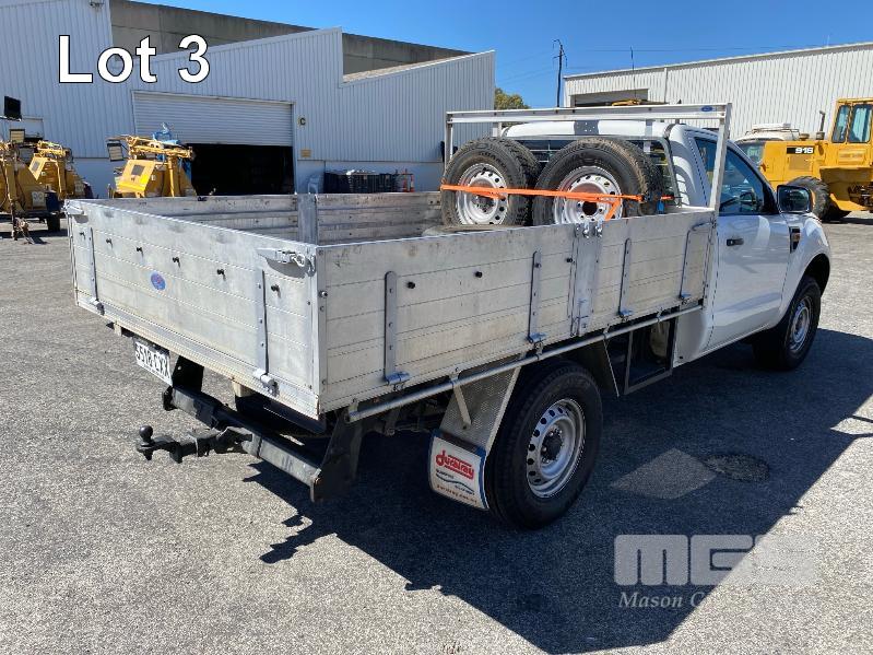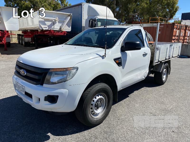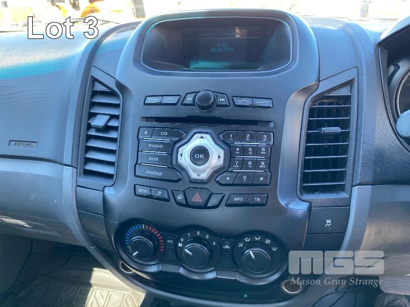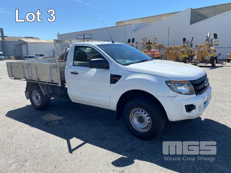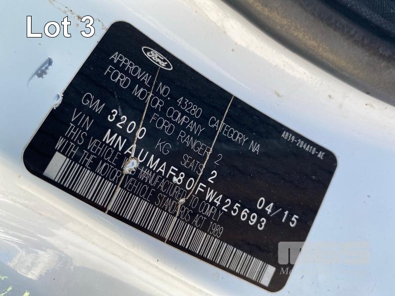 2015 FORD RANGER 2 SINGLE CAB TRAYTOP REG: S518 CXX (SA) VIN: MNAUMAF80FW425693 ENG: P4AT2025664 ODO: 224,334kms SHOWING 2.2 LITRE TURBO DIESEL, AUTOMATIC 6 SPEED TRANSMISSION, WHITE DUCO, 2 DOORS, 2 SEAT, ABS, AIR BAG, AIR CON, ALLOY TRAY, BLUETOOTH, CD PLAYER, CENTRAL LOCKING, CRUISE CONTROL, POWER STEERING, POWER WINDOWS, SPARE WHEEL, TOW BAR, 2 WAY RADIO 4 x SPARE RIMS & TYRES, TRAY SIZE: 2500 x 1900mm, 400mm HIGH SIDES KEY #8 (WITH PAPERS, WITH 1 KEY/S) CONDITION: LHS DOOR/CAB - DENTS