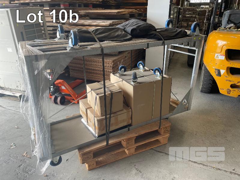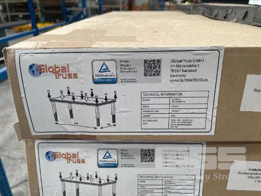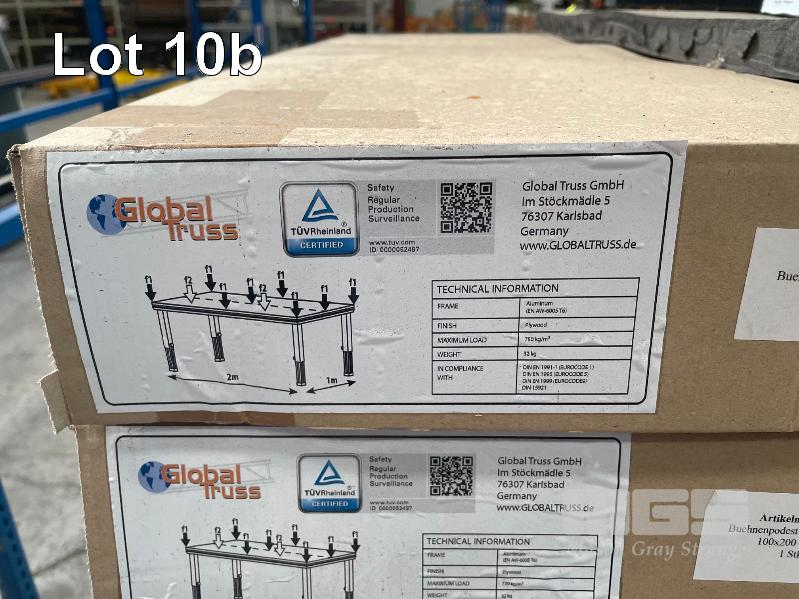 12 x GLOBAL TRUSS STAGE DECKS, ALLOY FRAME, PLYWOOD TOP, 2000 x 1000mm, (24m2 TOTAL), 750kg CAP, WITH HANDLING TROLLEYS & DOLLYS, BRAND NEW IN PACKAGING!