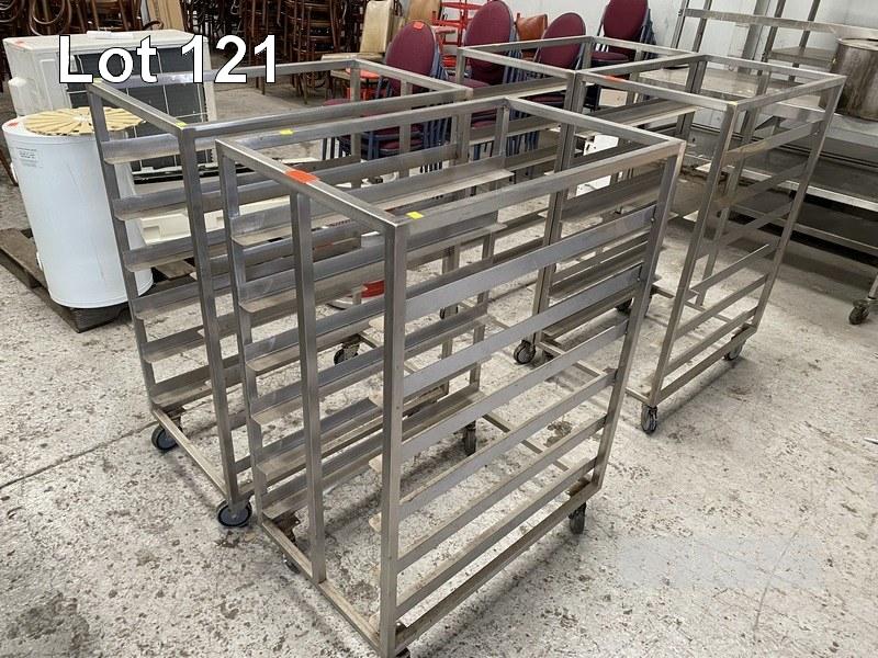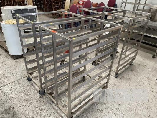 2 X STAINLESS STEEL MOBILE TRAY RACKS, 58 X 83CM, 6 TIER