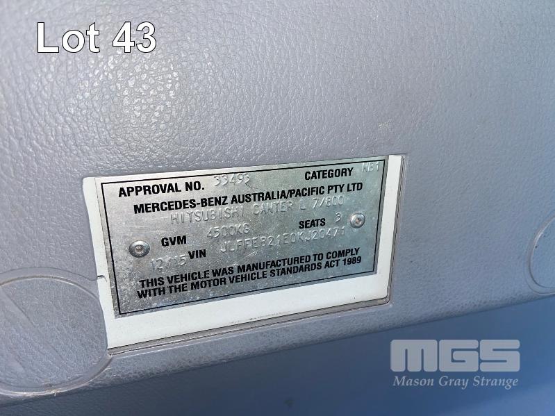 2015 FUSO CANTER PANTEC TRUCK REG: S672 CNS VIN: JLFFEB21EOLJ20471 ODO: 156,933kms SHOWING GVM: 4,500kg GCM: 8 TONNE AUTOMATIC TRANSMISSION, 3 SEAT, MOD: FEB21ER3SFAC 4.2 (L) x 2.3m (W) INSIDE DHOLLANDIA TAILGATE TOUCH SCREEN NOT OPERATIONAL