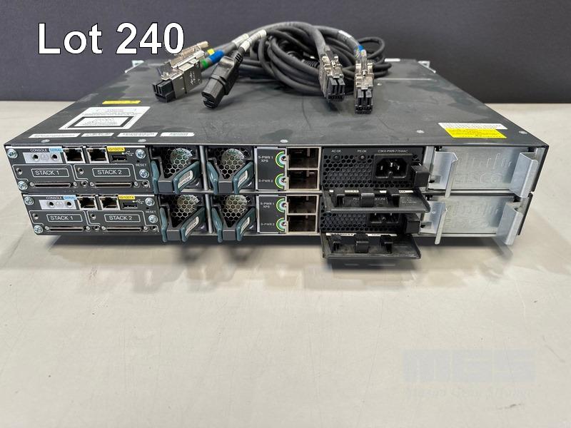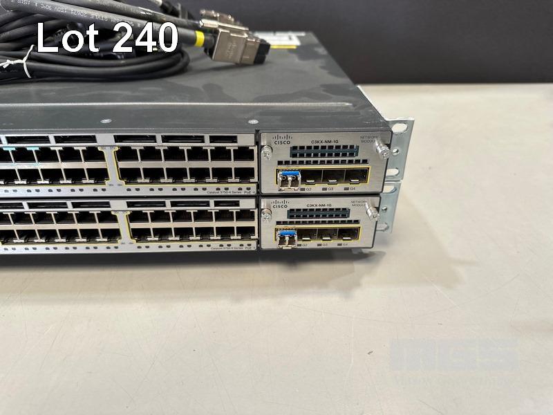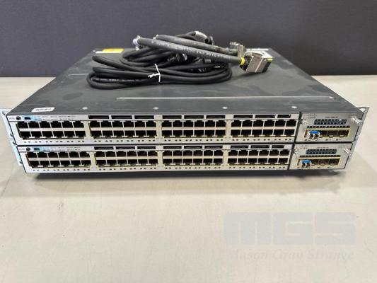2 x CISCO CATALYST 3750-X SERIES 48-PORT SWITCHES, WS-C3750X-48P-S V05 EACH WITH C3KX-NM-1G NETWORK MODULE, STACK CABLES & IEC-C15 NOTCH POWER CABLES S/N:FDO1741R2B1, FDO1742R0HH