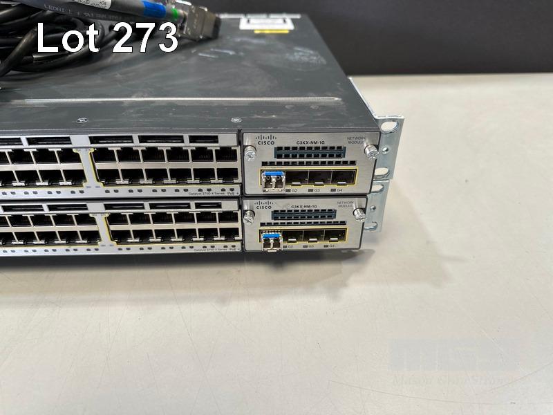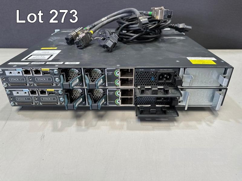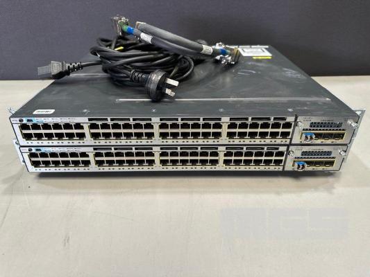 2 x CISCO CATALYST 3750-X SERIES 48-PORT SWITCHES, WS-C3750X-48P-S V05 EACH WITH C3KX-NM-1G NETWORK MODULE, STACK CABLES & IEC-C15 NOTCH POWER CABLES S/N:FDO1723Z09T, FDO1741R2AF