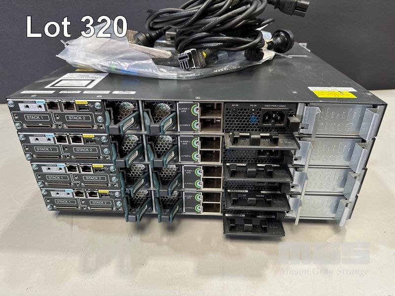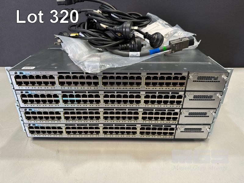 4 x CISCO CATALYST 3750-X SERIES 48-PORT SWITCHES, WS-C3750X-48P-S V05 EACH WITH STACK CABLES & IEC-C15 NOTCH POWER CABLES S/N:FDO1745P009, FDO1741R2AB, FDO1741R2B7, FDO1741R29P