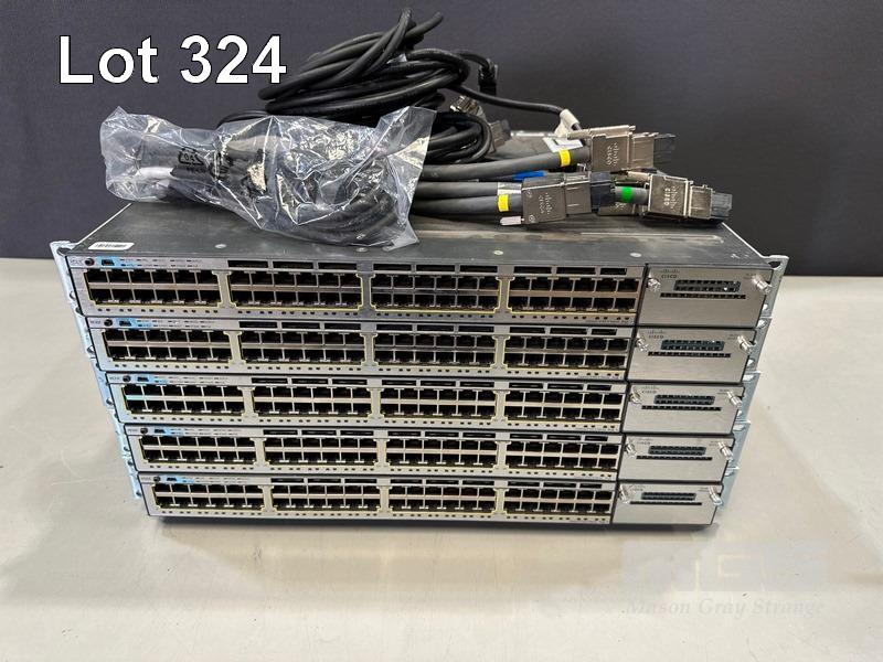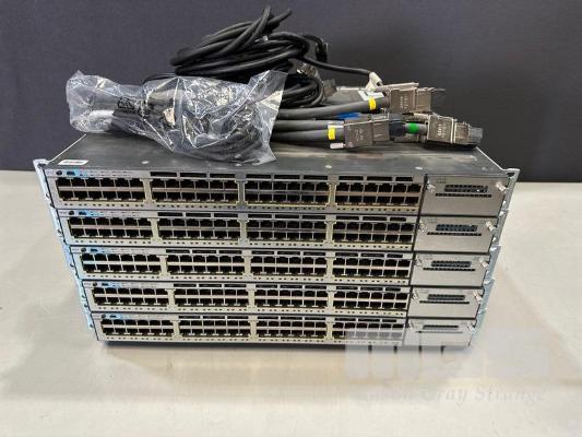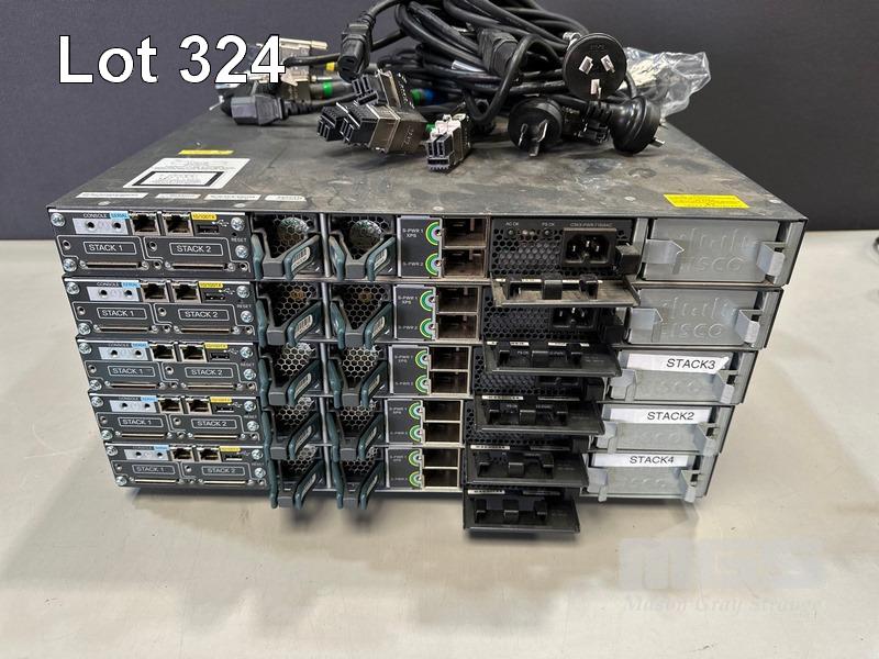 5 x CISCO CATALYST 3750-X SERIES 48-PORT SWITCHES, WS-C3750X-48P-S V02 & V03 EACH WITH STACK CABLES & IEC-C15 NOTCH POWER CABLES S/N:FDO1628R2YY, FDO1630R3XQ, FDO1618R0ZY, FDO1608K1S6, FDO1618R101