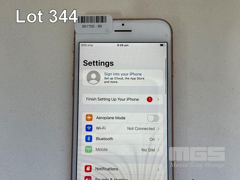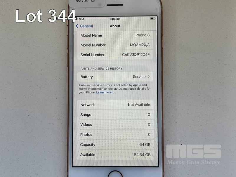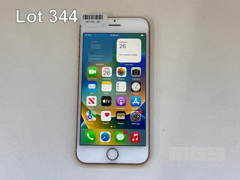 APPLE iPHONE 8, 64GB, GOLD, MODEL MQ6M2X/A (NO CABLE, NO CHARGER) (NOTE: BATTERY SERVICE MESSAGE) S/N:C6KVJQ91JC6F