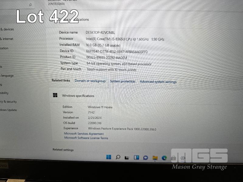 LAPTOP, LENOVO THINKPAD T590, TYPE 20N5, CORE i5 8365U (8TH GEN) @ 1.6GHz, 16GB DDR4 RAM, 256GB NVMe M.2 SSD, 15.6" TOUCHSCREEN (1920x1080), INTEL UHD GRAPHICS, Wi-Fi, BLUETOOTH, WINDOWS 11 HOME INSTALLED (NO USB-C POWER SUPPLY) (NOTE: USB-C PORT FAULTY, MARKS ON SCREEN) S/N:PF1BNTBG