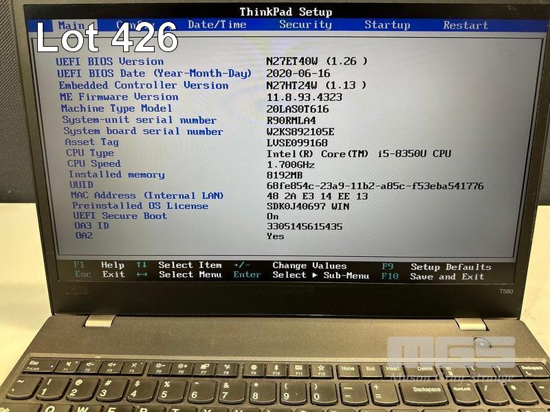 LAPTOP, LENOVO THINKPAD T580, TYPE 20LA, CORE i5 8350U (8TH GEN) @ 1.7GHz, 8GB DDR4 RAM, 256GB NVMe M.2 SSD, 15.6" WIDESCREEN (1920x1080), INTEL UHD GRAPHICS, Wi-Fi, BLUETOOTH, WINDOWS 11 PRO INSTALLED (NO USB-C POWER SUPPLY) (NOTE: MARKS ON SCREEN) S/N:R90RMLA4