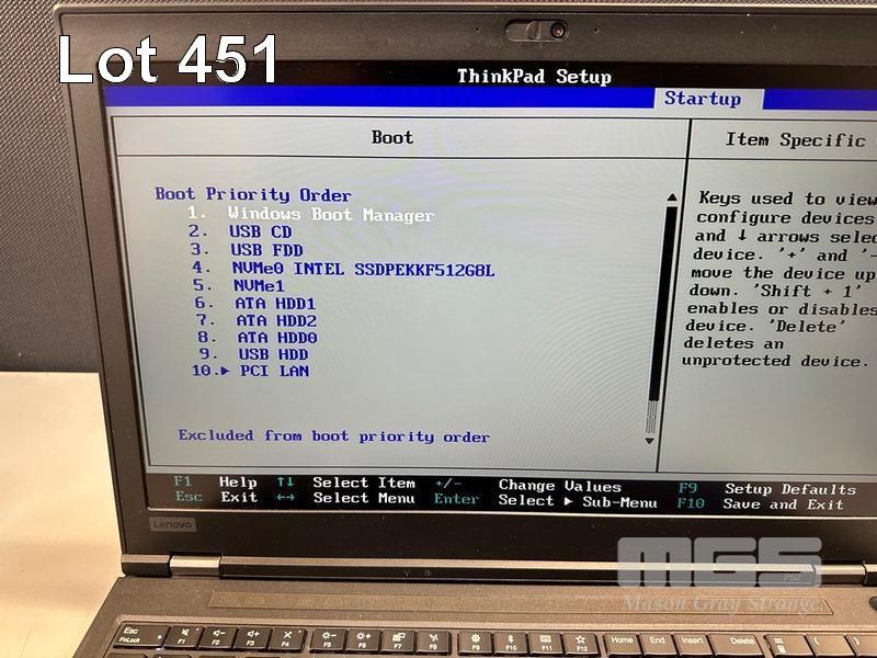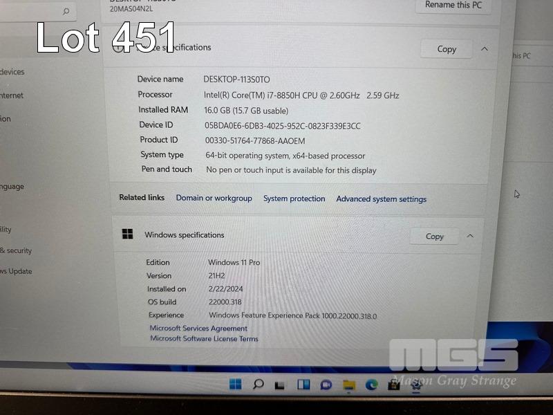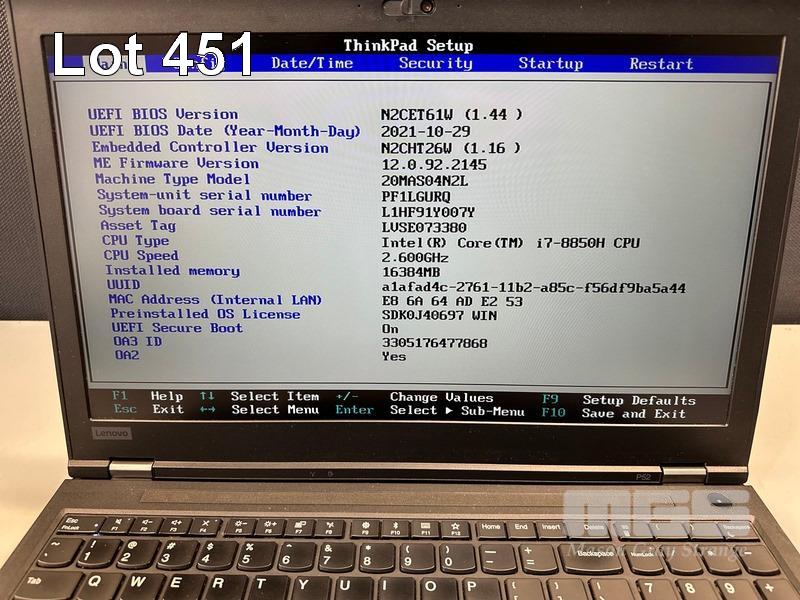 LAPTOP, LENOVO THINKPAD P52 MOBILE WORKSTATION, TYPE 20MA, CORE i7 8850H (8TH GEN) @ 2.6GHz, 16GB DDR4 RAM, 512GB NVMe M.2 SSD, 15.6" WIDESCREEN (1920x1080), 4GB NVIDIA QUADRO P2000 VIDEO, Wi-Fi, BLUETOOTH, WINDOWS 11 PRO INSTALLED (NO POWER SUPPLY) (NOTE: MARKS ON SCREEN) S/N:PF1LGURQ
