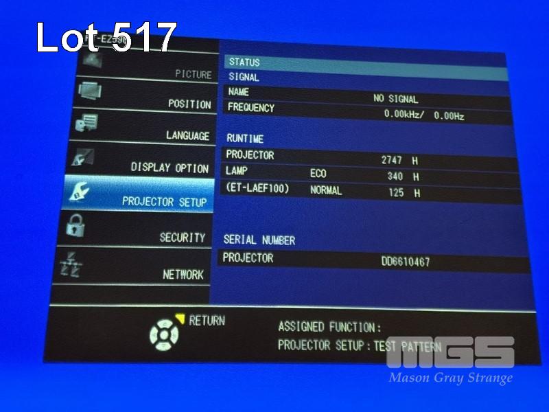 PROJECTOR, PANASONIC PT-EZ590 WUXGA 3LCD, 5,400 LUMENS, 340 ECO HOURS, 125 NORMAL LAMP HOURS SHOWING (PROJECTOR RUNTIME 2,747 HOURS) (NO REMOTE) S/N:DD6610467